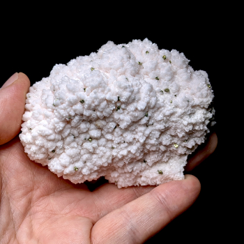 Cristallisation de manganocalcite avec un rose léger et un aspect nacré, recouverte de petits cristaux de pyrite.Cette pièce provient de Madan, province de Smolyan, Bulgarie.Elle mesure 8,3 cm de long pour 6,5 cm de large et 3,8 cm d'épaisseur.Son poids est de 201 grammes.Référence : 1173Photos...