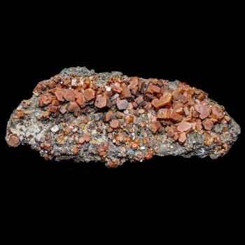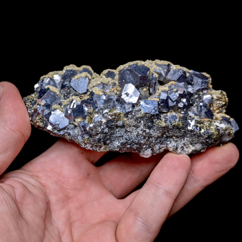 Cristaux de pyrite dorée sur hématite de l’île d’Elbe.4 x 2,5 x 2,5 cmRéférence : 0432