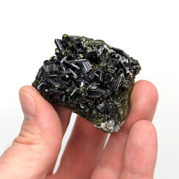 Épidote brillante, avec des cristaux de couleur vert foncé sur gangue. Elle provient du Mont Khorram, Tafresh county, Iran. Cette pièce mesure 4,8 cm de long pour 3,9 cm de large et 2,7 cm d'épaisseur. Son poids est de 78 grammes.Photos supplémentaires et commande en ligne sur le site DGminéraux...