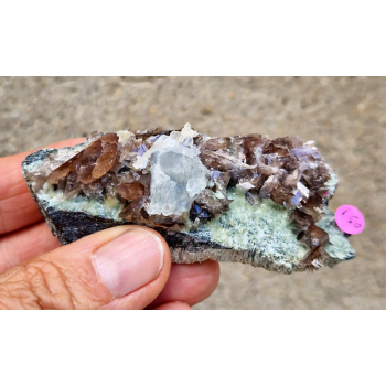 Fluorine rose + baryte de Saint Péray – Ardèche (07) - FranceMinéraux : Fluorine + Baryte + chalcopyriteDimension (cm - L x l x H) : 13 x 8 x 4 cmPoids : 532 grammesPrix : 34 € HFPInformations complémentaires : Pièce provenant de Saint Péray (07)Plaquage de fluorine rose très claire avec des...