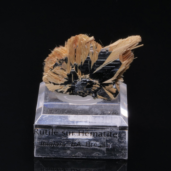 Superbe pièce du Brésil présentant des cristaux de Rutile doré en épitaxie sur Hématite miroir noire. Les cristaux de Rutile paraissent duveteux (même s’il ne faut pas y toucher) et forment vraiment comme une chevelure sur l’Hématite.4,50 x 3,10 x 1,10 cmRéférence : 2938