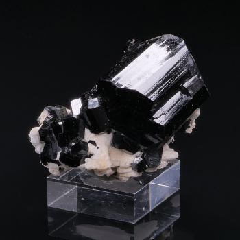 Cristal principal de Schorl trapu et biterminé associé à des cristaux plus petits mais très bien cristallisés, le tout sur gangue de Microcline qui apporte un fort contraste.5,40 x 4,70 x 3,30 cmRéférence : 2993