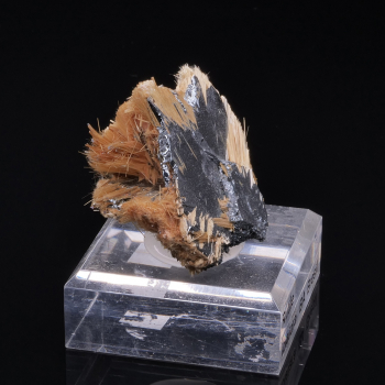 Superbe pièce du Brésil présentant des cristaux de Rutile doré en épitaxie sur Hématite miroir noire. Les cristaux de Rutile paraissent duveteux (même s’il ne faut pas y toucher) et forment vraiment comme une chevelure sur l’Hématite.6 x 4,60 x 2,80 cmRéférence : 2998