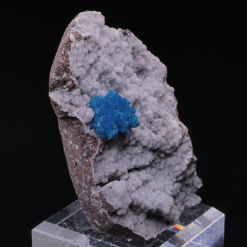 Géode avec d’un côté des pompons de cristaux de Cavansite bleu électrique parfaitement formés et de l’autres des cristaux de Stilbite presque incolores qui contrastent et apportent de la lumière à la pièce.7,20 x 6,40 x 6 cmRéférence : 3050