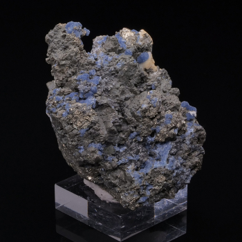 Multitude de sphères bleue électrique de cristaux de Vauxite sur Pyrite brillante qui donne un beau contraste de couleur.5,20 x 5,10 x 4,60 cmRéférence : 2845