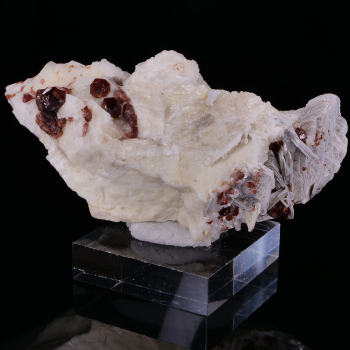 Spécimen à double faciès : sur le côté nous avons des pétales de Muscovite très bien formés associés à des Grenat Spessartine orange intense, et sur l’avant des Spessartine bien cristallisés sur gangue massive. Très bel ensemble provenant du Pakistan.8,40 x 4,80 x 3,50 cmRéférence : 2547