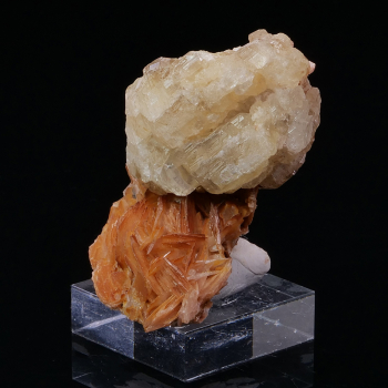 Cristal de Cérusite sur Baryte orange provenant de la mine Les Dalles au Maroc. La Cérusite réagit bien aux UV pour devenir jaune citron.4,50 x 4 x 3,90 cmRéférence : 2185