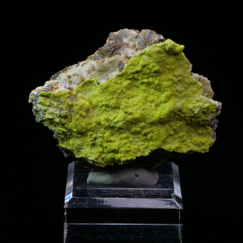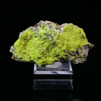 Spécimen de Meta-Autunite jaune vert fluo qui réagit fortement aux UV (voir autres photos). Attention, pièce uranifère.6,40 x 5,20 x 2,50 cmRéférence : 2168
