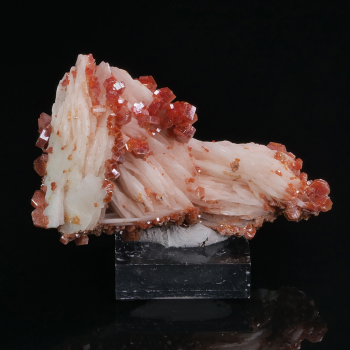 Cristaux de Spinelle rouge rubis, gemmes et brillants, qui font contraste avec leur gangue de Calcite blanche. Cristal principal : 1,10 x 1 x 0,95 cm.4,50 x 2,40 x 1,10 cmRéférence : 1410