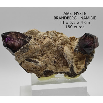 Deux cristaux d'améthyste avec de beaux zonages fumés, à noter un très petit choc sur un des cristaux11 x 5,5 x 4 cmRéférence : 0085