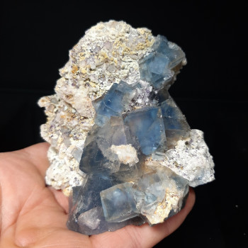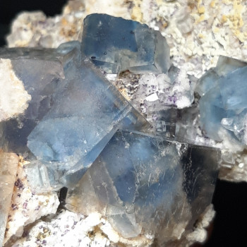 Pièce classique de la célèbre mine du Beix. Les cristaux ont une belle couleur bleu soutenue. le contraste avec les lames de quartz blanc est bon. On remarque une deuxieme génération classique de microcubes violets. Pièce avec un bon volume avec néanmoins quelques imperfections. 9 x 8,5 x 6,5...