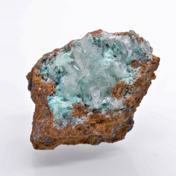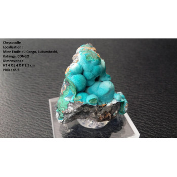 Excellente pièce de Chrysocolle sur Malachite. Très bon esthétisme et belle cristallisation mamelonnée de la Malachite. En effet, la Chrycocolle cristallise par dessus (Périmorphose). La photo de profil nous montre bien ces différents couches.4 x 4 x 2,5 cm0070-LCL