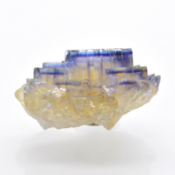 cristal de fluorite d'un bleu intense du à de multiples zones de croissance. Le cristal présente un côté échancré . le coeur du cristal est jaune. On note une jolie troncature sur le sommet du cristal. les fantômes sont trés agréables et la couleur globale n'est pas trop sombre . l'aspect de...