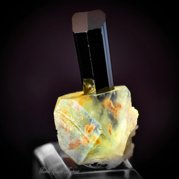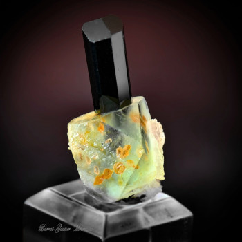 Association incroyable pour ce Thumbnail, d'une tourmaline Schorlite avec un cristal de Fluorite, des grenats spessartite sont en inclusion dans la Fluorite pour parfaire l'ensemble2,1 x 1,4 cmRéférence : 0117