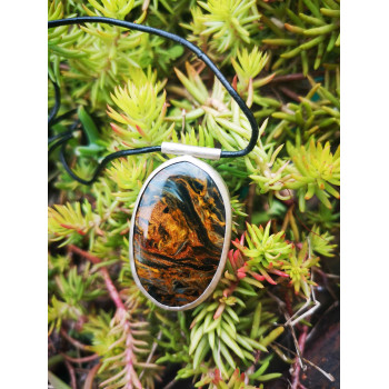 pendentif avec pietersite sertie en argent 925, pièce unique dimensions du bijoux : 4.5 x 2.7 x 0.7 cm provenance de la pierre : Namibie taille et sertissage réalisés en France