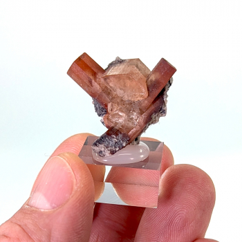 Esthétique petit groupe de cristaux de vanadinite brillante, de couleur soutenue.Cette pièce vient de Mibladen, situé dans la région de Midelt, Drâa-Tafilalet, Maroc.Cet échantillon affiche des dimensions de 3,4 x 2,9 x 2,7 cm.Le poids de ce minéral est de 36 grammes.(Mesures hors socle) Photos...