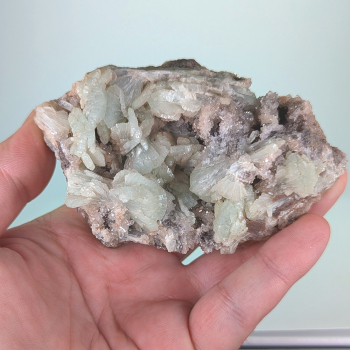Classique échantillon de prehnite en casque sur matrice.Il provient de La Combe de la Selle, St Christophe-en-Oisans, Bourg d'Oisans, Isère, Auvergne-Rhône-Alpes, France.Cet échantillon mesure 6,4 cm de long pour 4,5 cm de large et 3,1 cm d'épaisseur.Il pèse 77 grammes.Photos supplémentaires et...