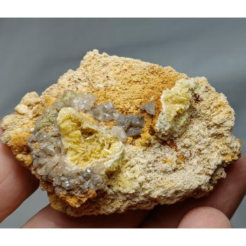 Petite pièce très originale avec mimétite jaune, cérusite et un léger saupoudrage de duftite, provenant de Tsumeb, Namibie,6,2 cm.Référence : 0352