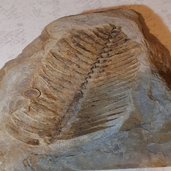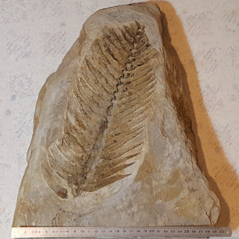 Superbe et imposante plaque avec un rameau de Ptilophyllum pectinoides, jurassique moyen (dogger) de Witby, Yorkshire, Angleterre, pièce ancienne, très décorative, introuvable de nos jours. Poids important, pas d'expédition hors de France.37 x 32 cm.Référence : 0077-RuFo