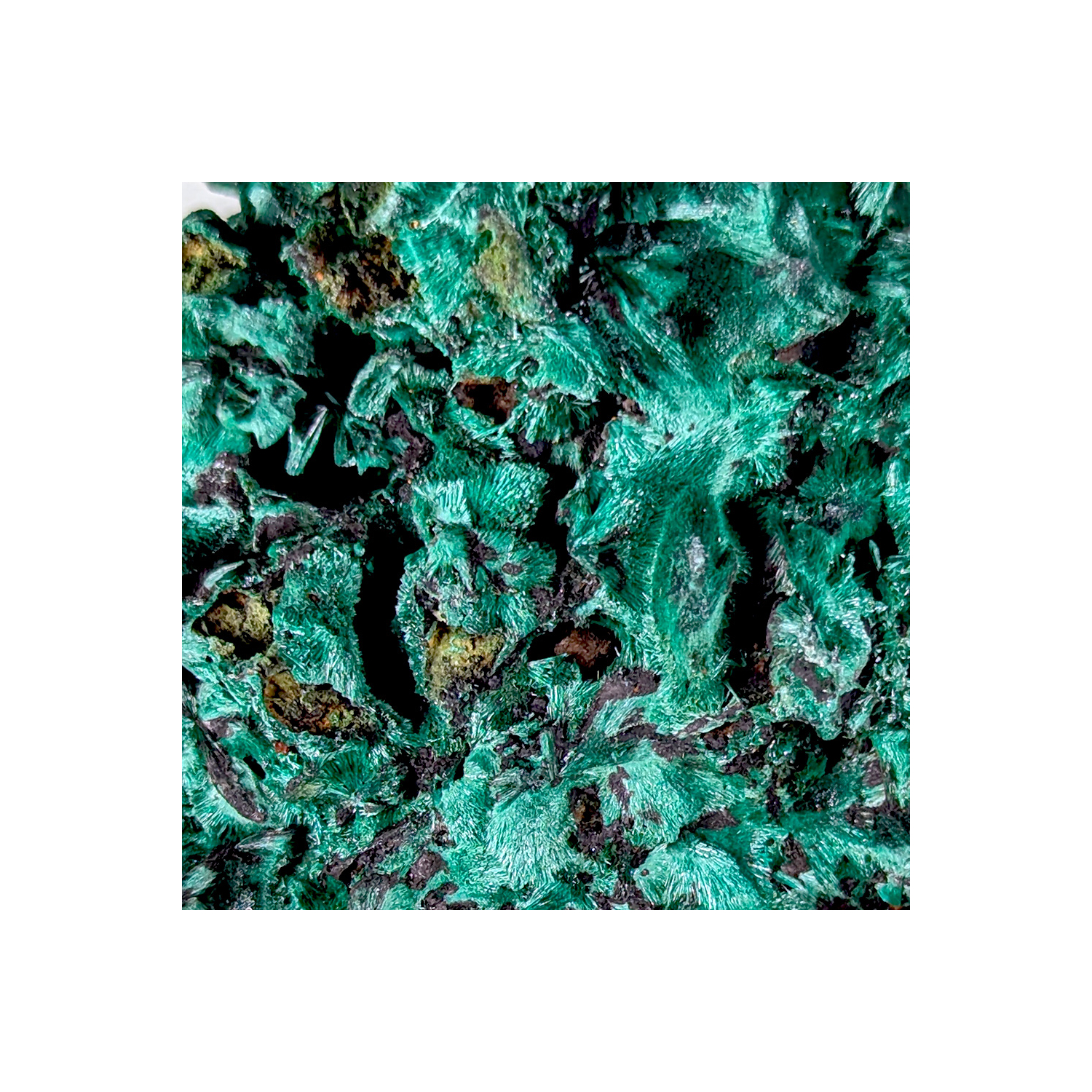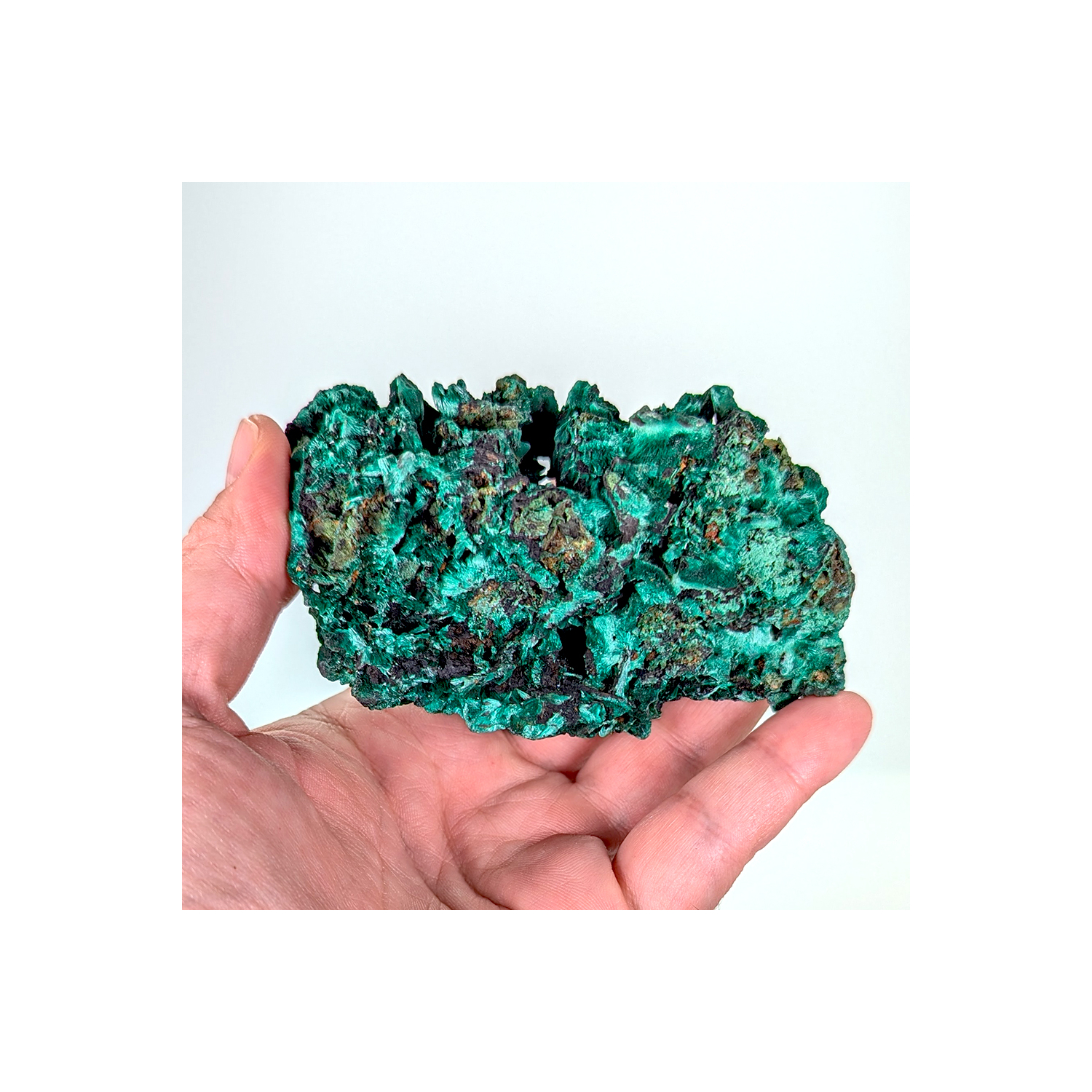 Pièce de malachite fibreuse de belle couleur et brillante, cristallisée sur tout son pourtour.