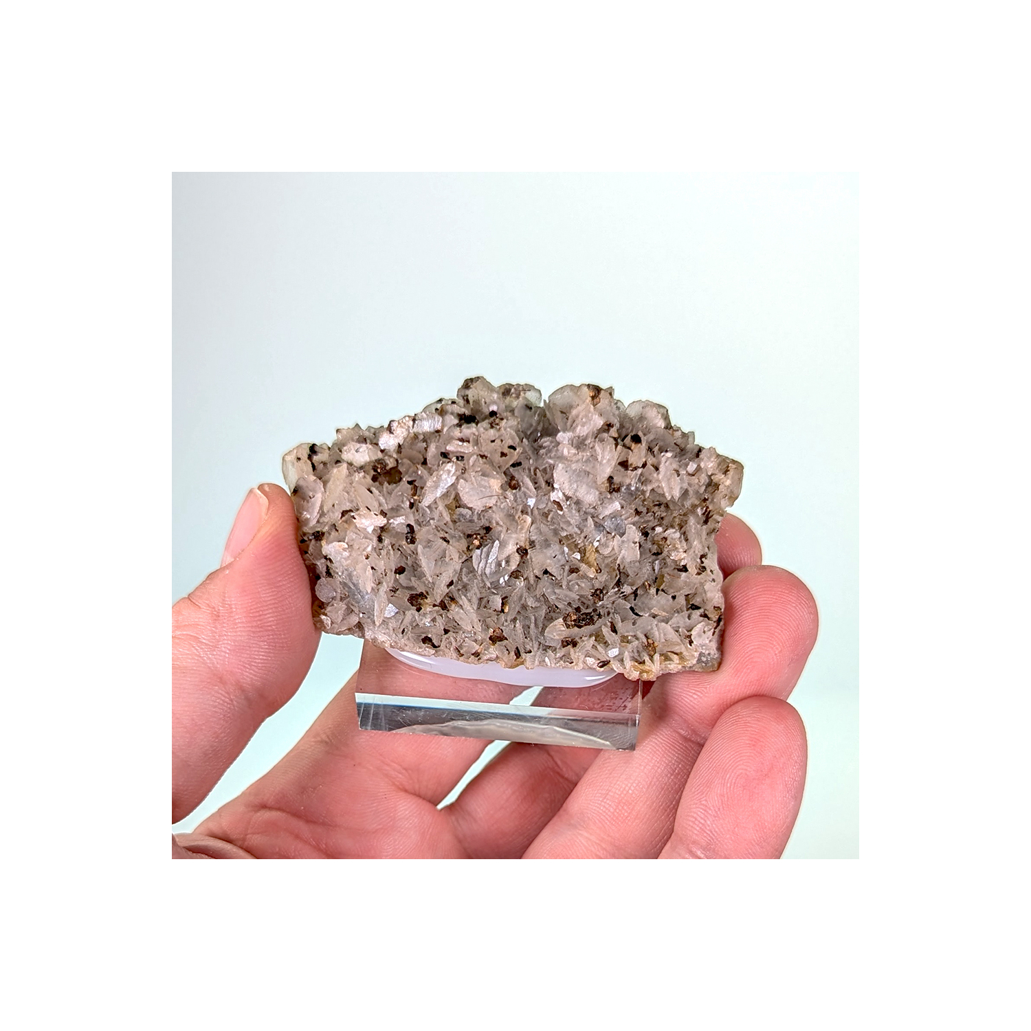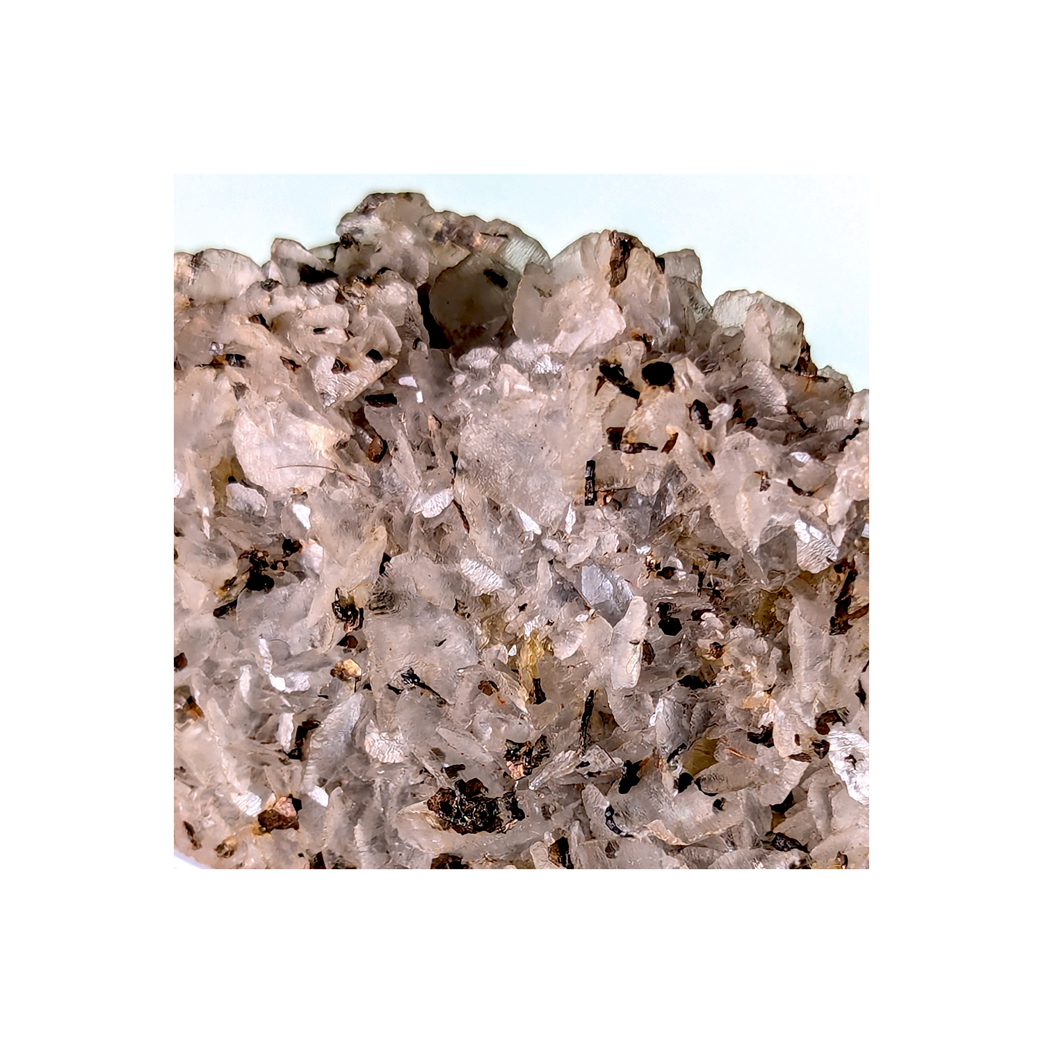 Échantillon de dolomite grise partiellement recouverte par des cristaux millimétriques de pyrrhotite.