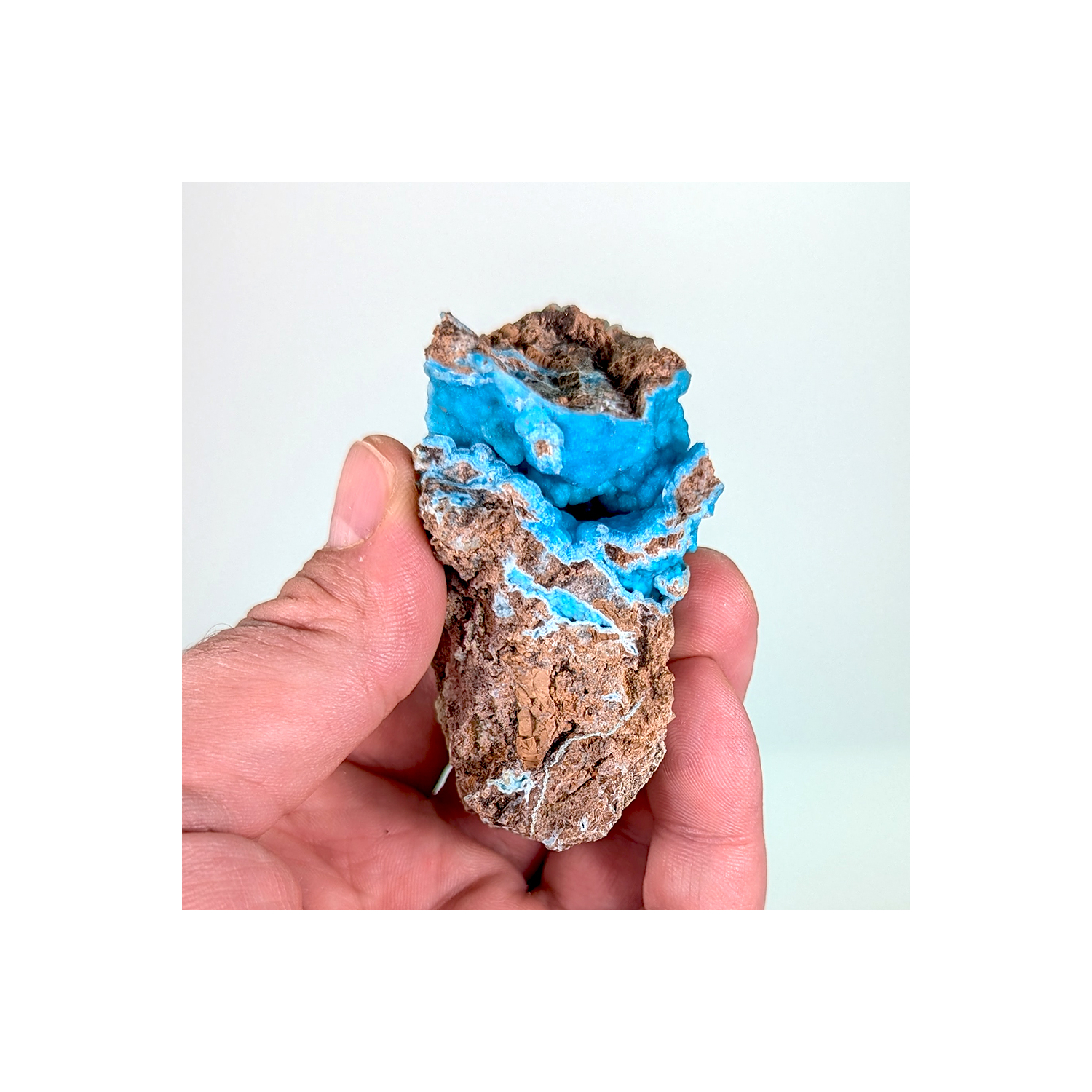 Jolie couleur bleue pour cette hémimorphite botroïdale contenue dans une géode.
