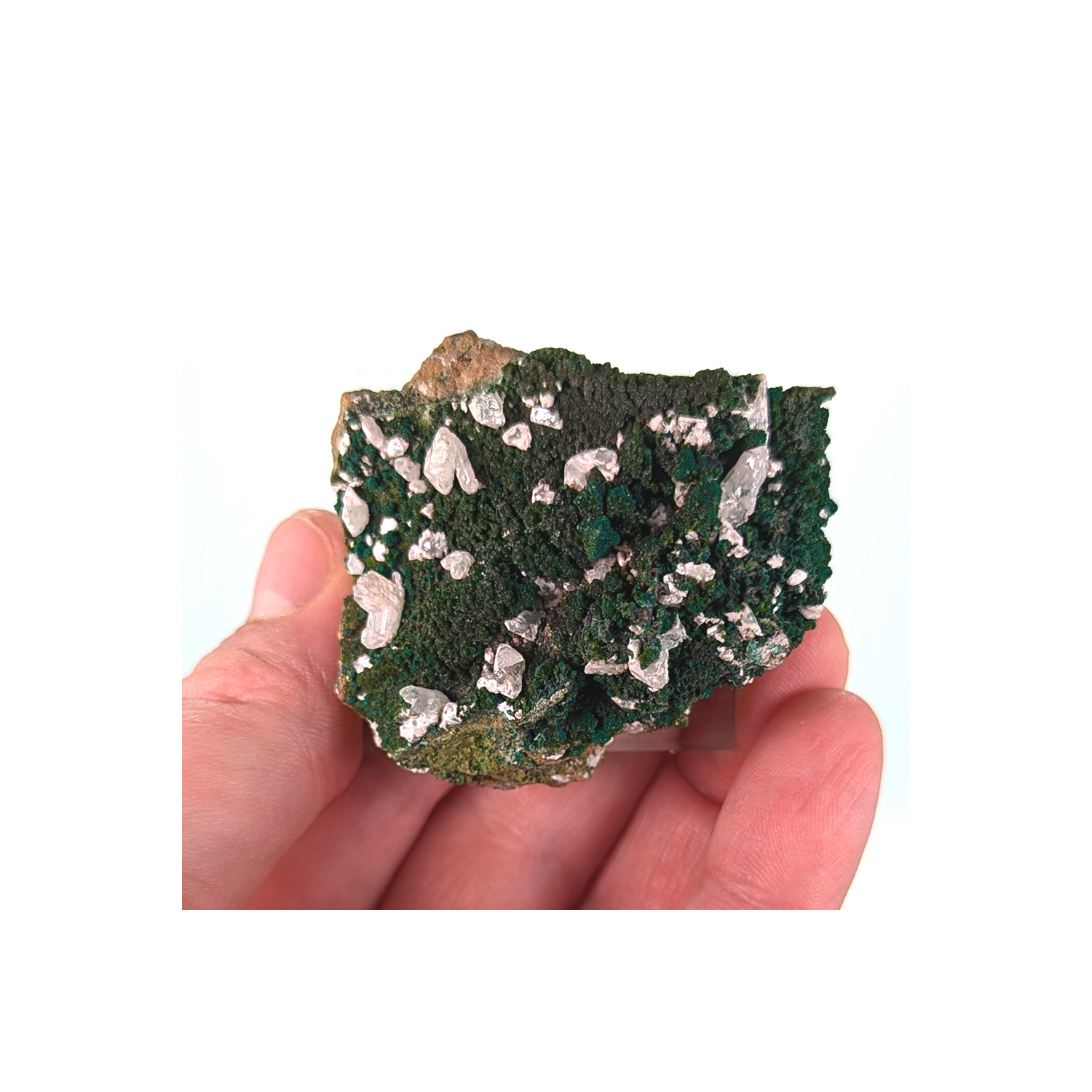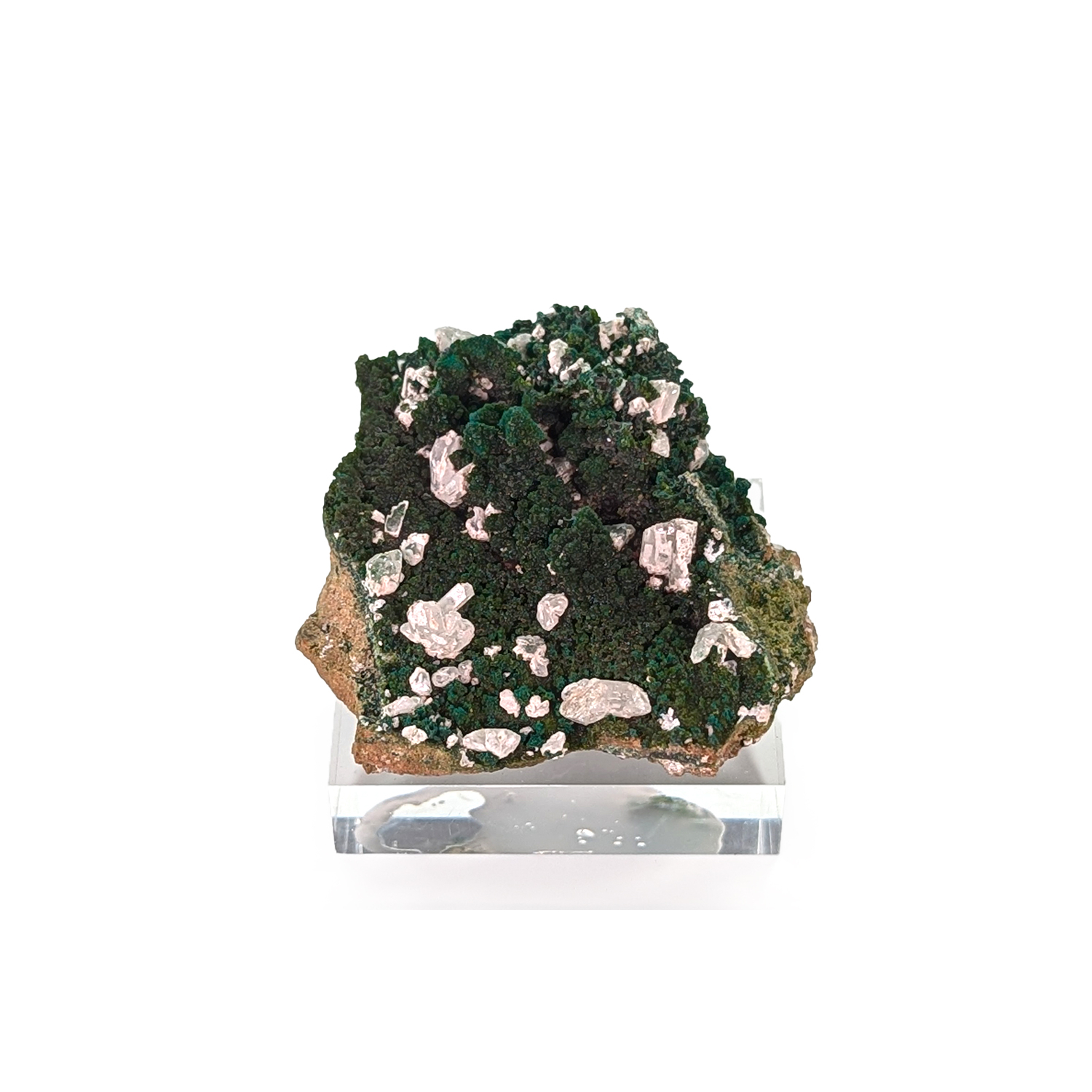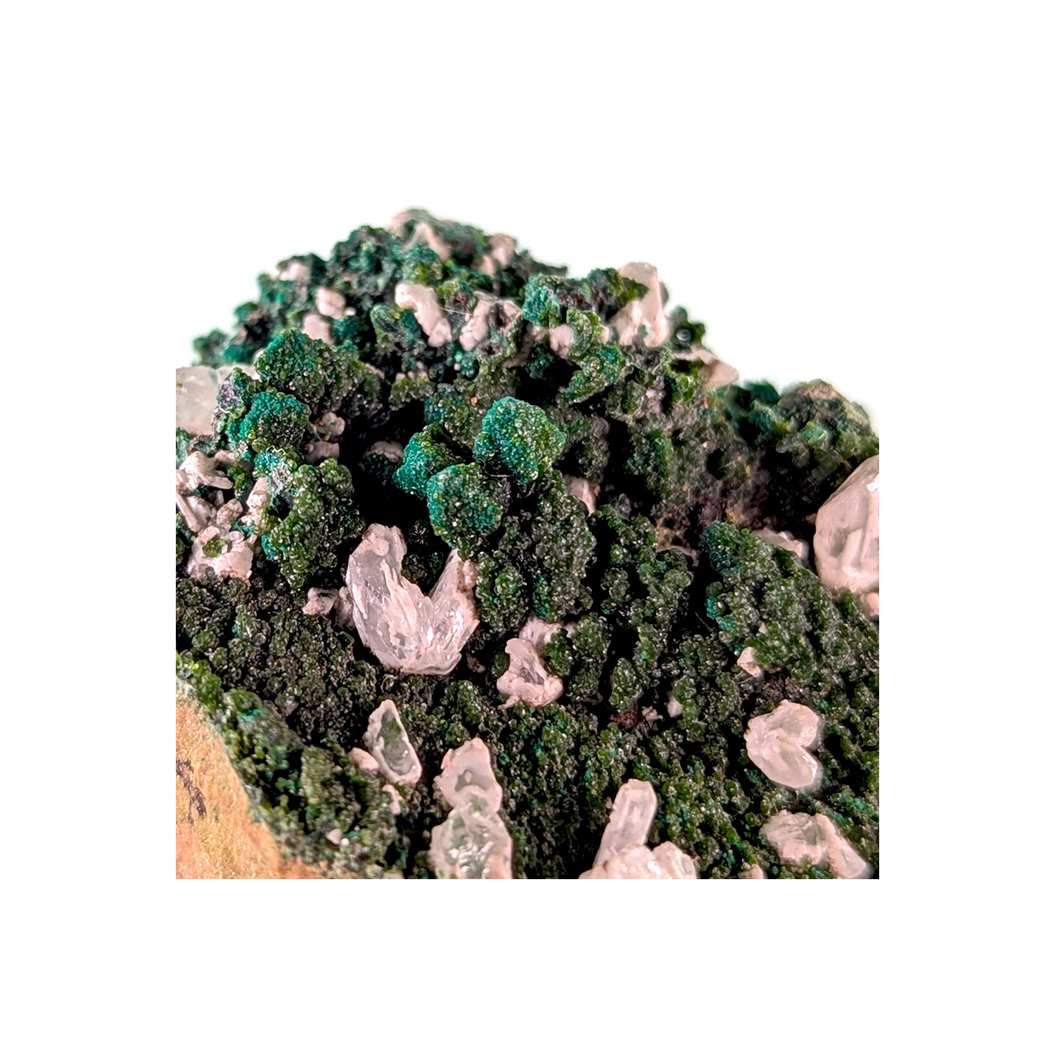 Ancien échantillon namibien, avec un tapis de malachite recouvert par des cristaux de cérusite blanche.