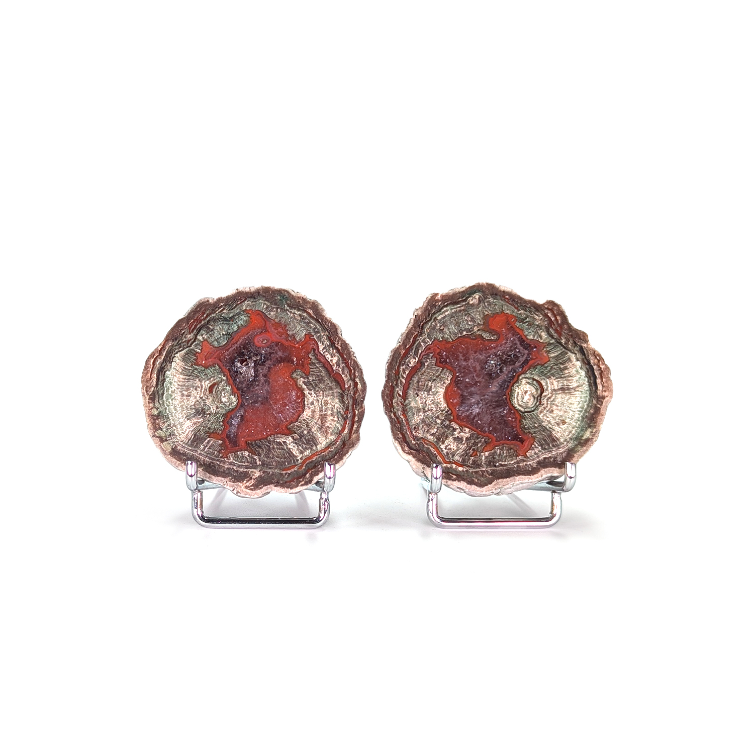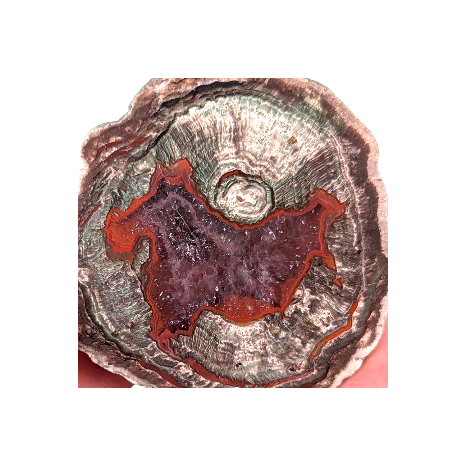 Nodule de lithophyse coupé en deux et poli, offrant un beau motif rouge et vert.