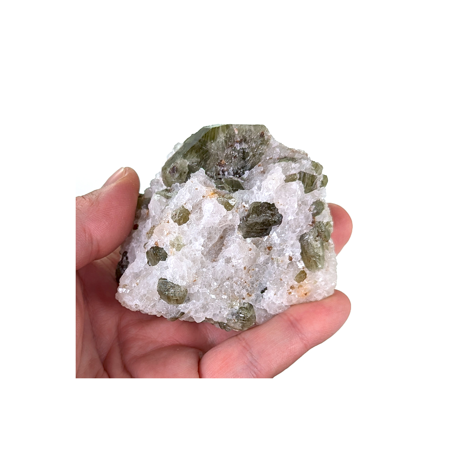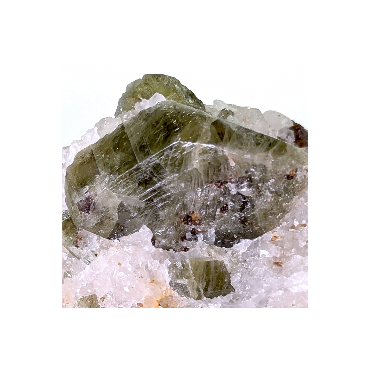 Pièce présentant des cristaux de diopside, dont le plus grand mesure plus de 3 cm, pris dans du quartz.