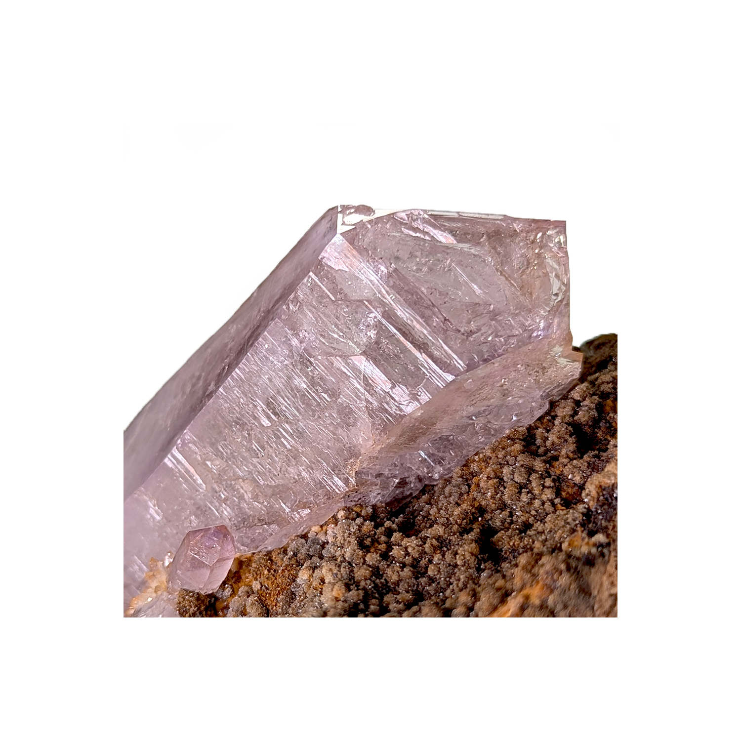 Imposant cristal d'améthyste de couleur mauve claire sur matrice avec une croissance légèrement squelettique et des marques de fractures reconsolidées.