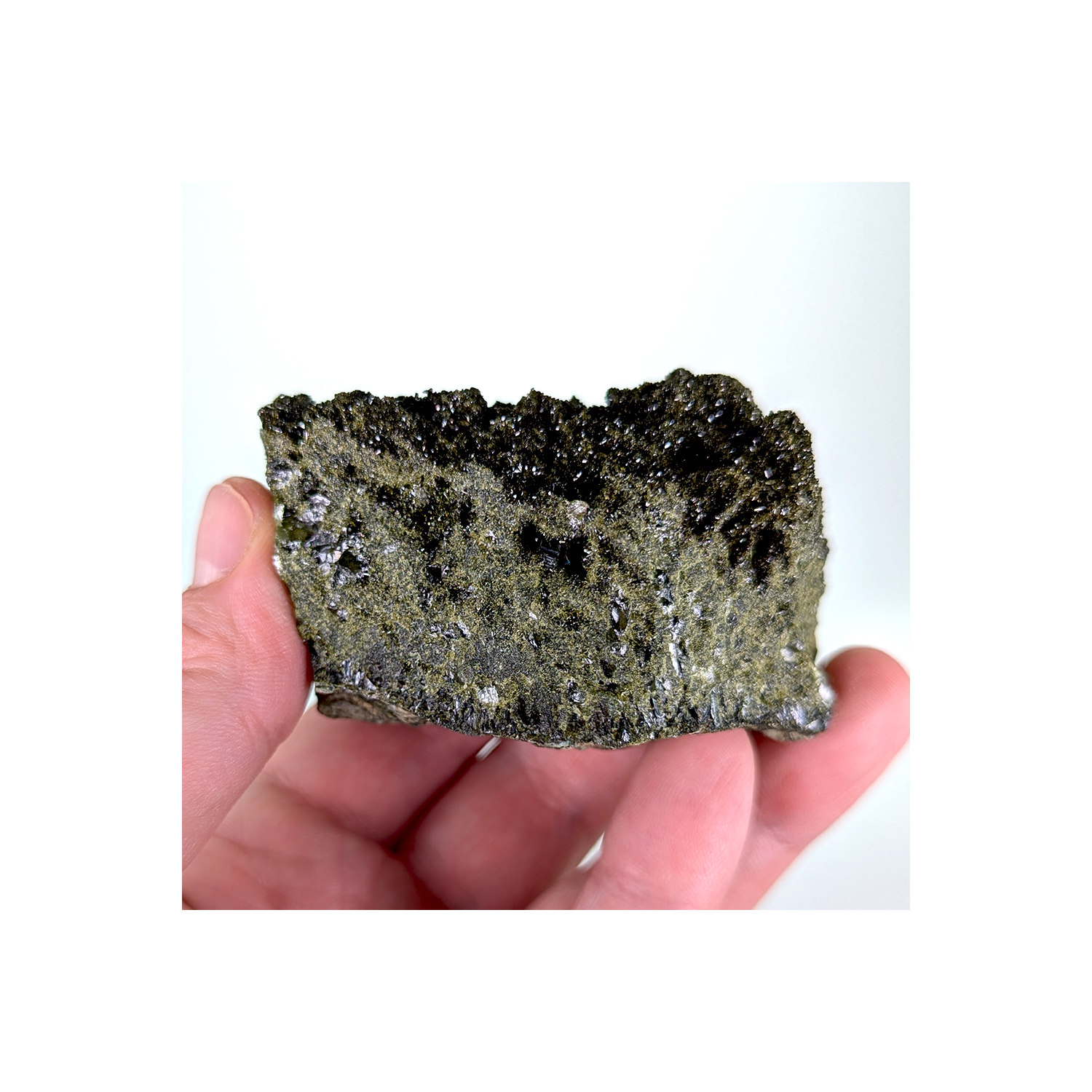 Fine cristallisation d'épidote brillante, verte foncée, sur une gangue d'épidote brute.