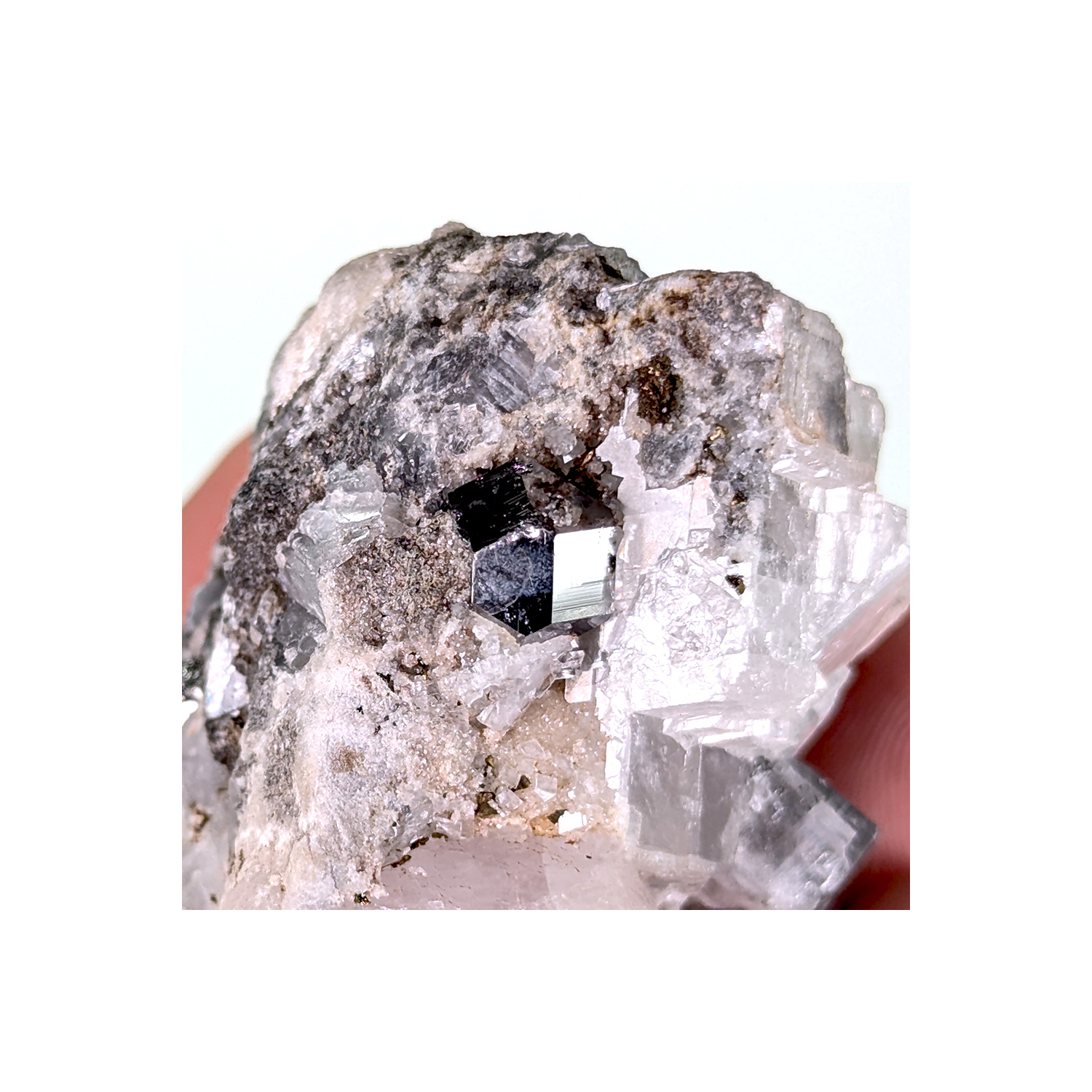 Spécimen mettant en valeur un cristal carrollite bien défini sur de la calcite, association typique du gisement.
