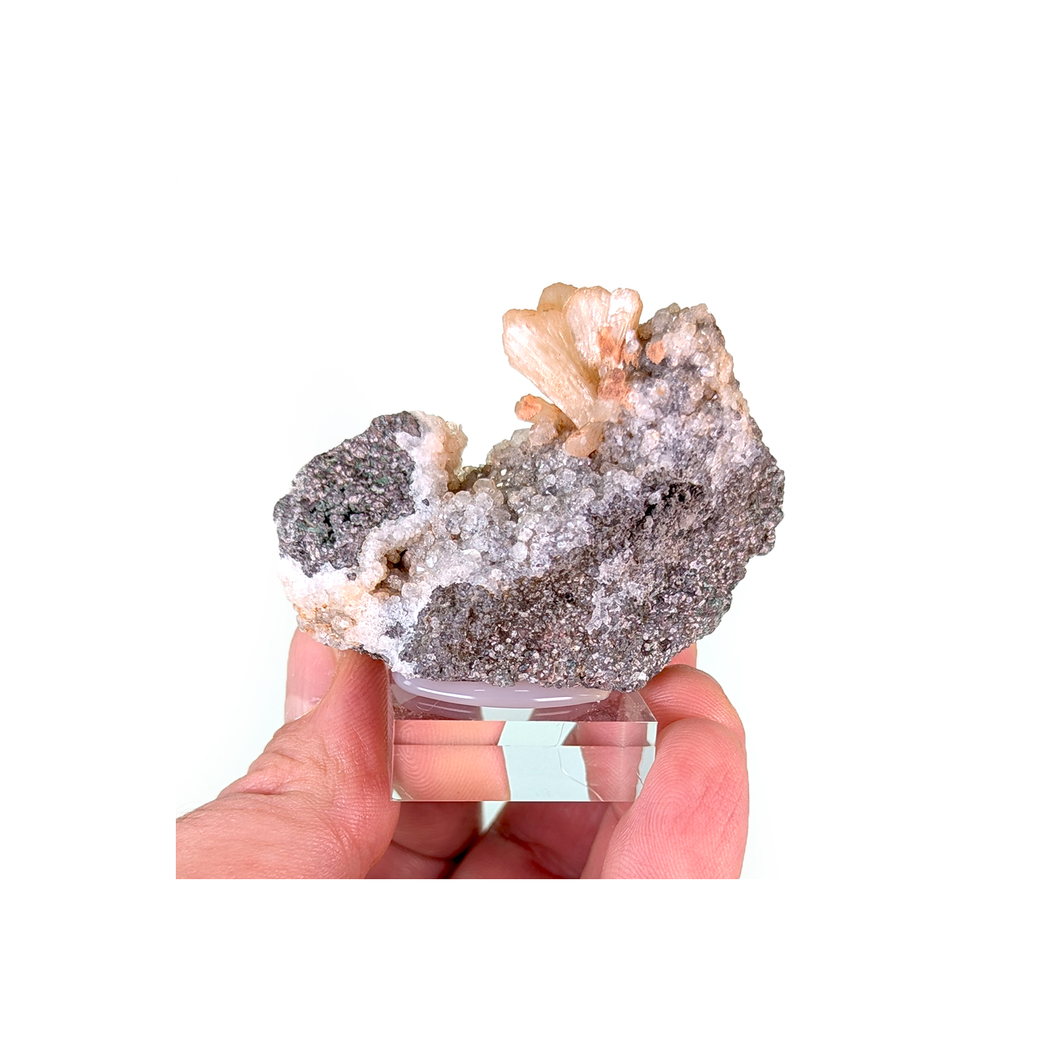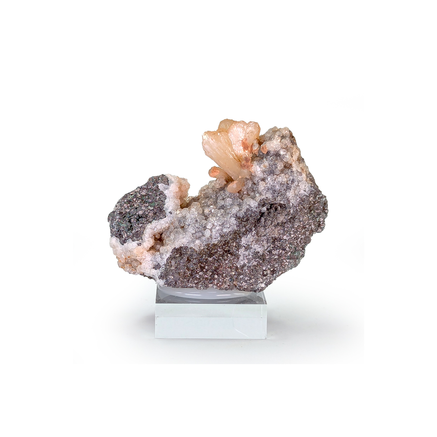 Gerbe de stilbite sur un tapis d'analcime, provenant d'un gisement rarement présenté.