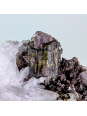 Échantillon brésilien constitué de cristaux de cleavendite blanche, portant de nombreux cristaux de tourmaline verte et brillante, ainsi qu'un cristal de tourmaline plus épais dit "melon d'eau" (corps vert et cœur rose).
