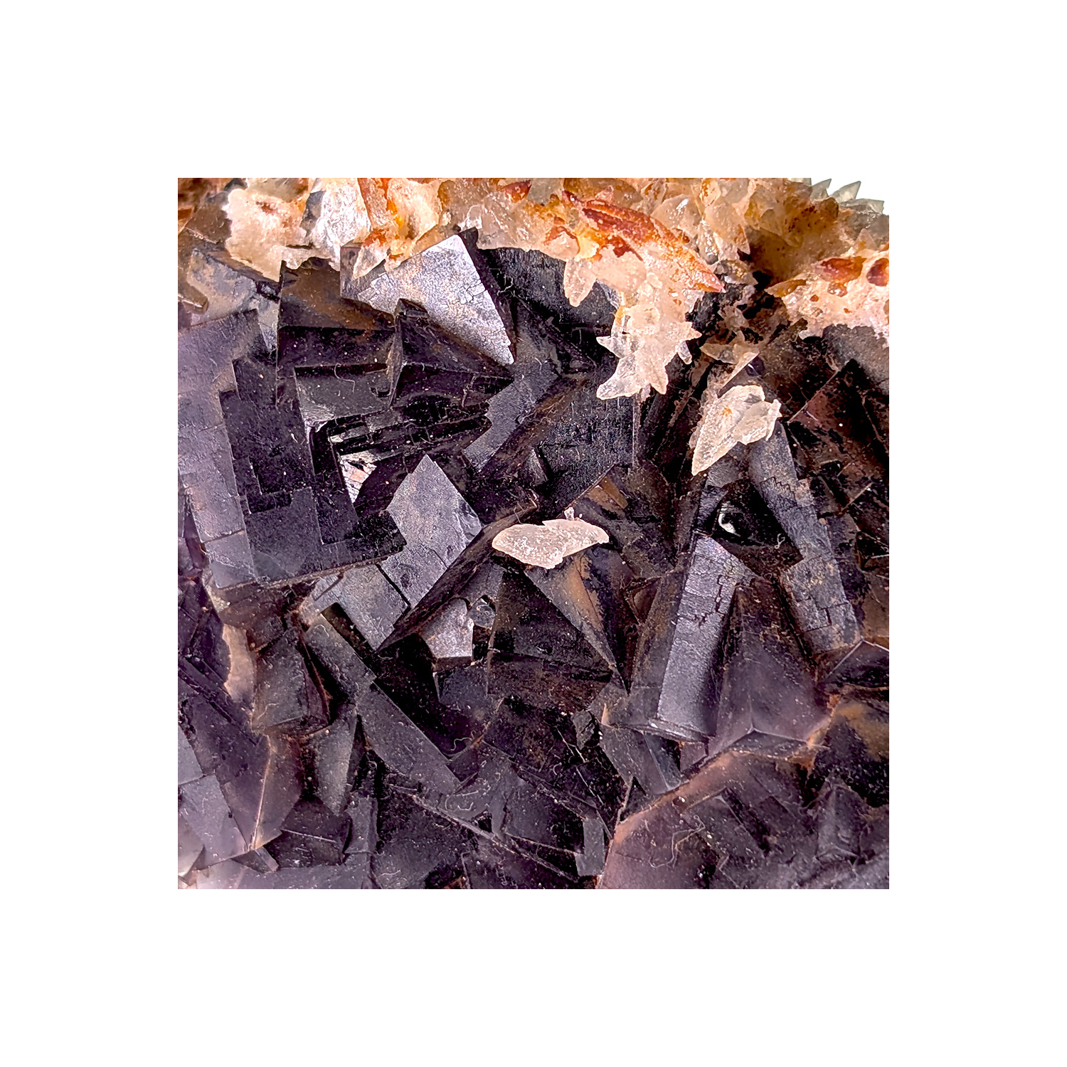 Fluorite bleu-violet avec une seconde cristallisation de calcite recouvrant le dos de la pièce.