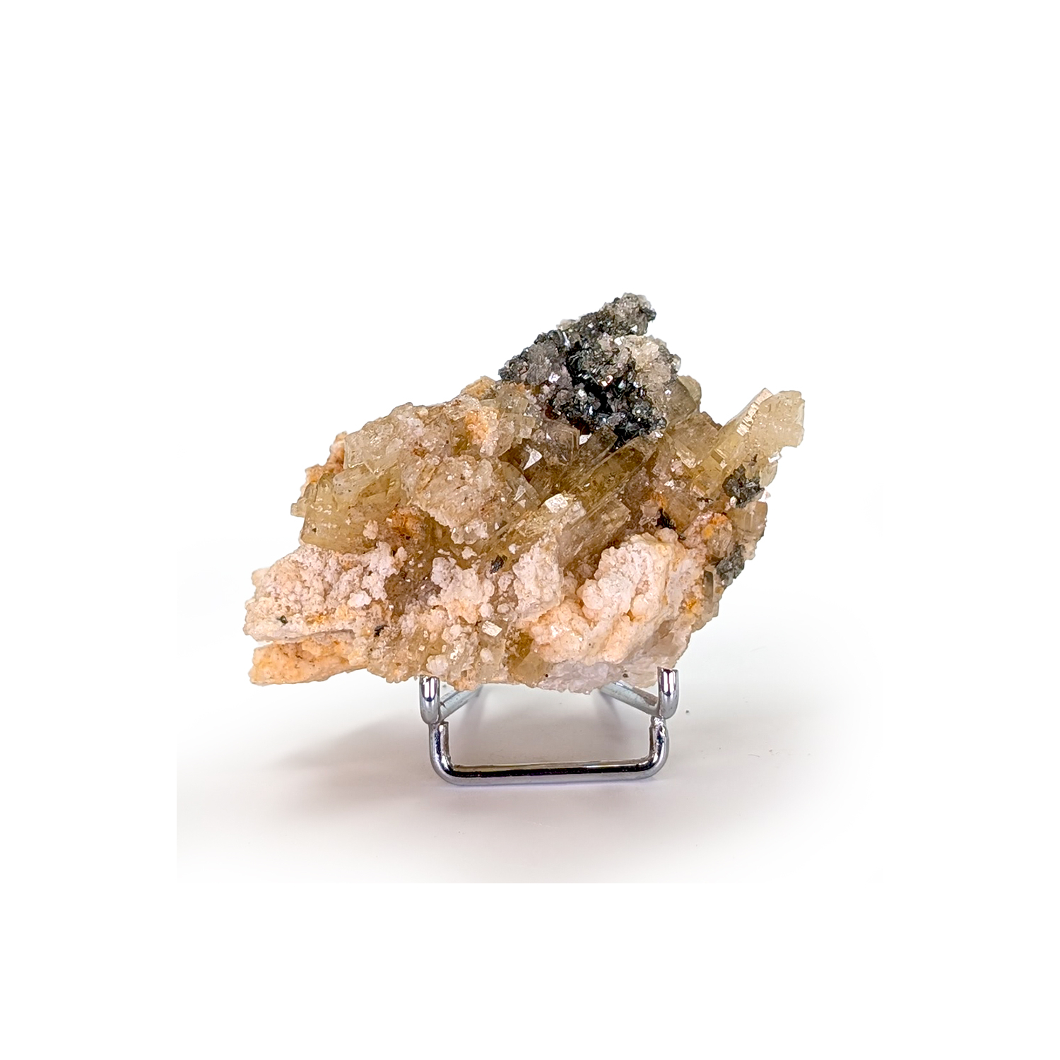 Échantillon agréable de baryte jaune et brillante accompagnée de pyrite sur une gangue de baryte brute.