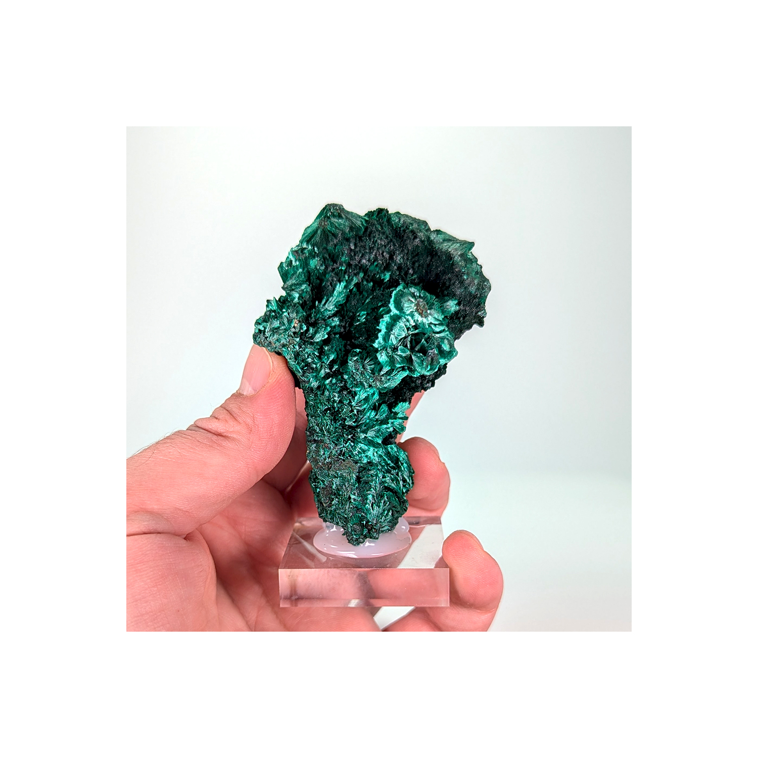 Superbe malachite fibreuse à la brillance marquée et à la couleur intense, présentant un aspect différent sur chaque face.