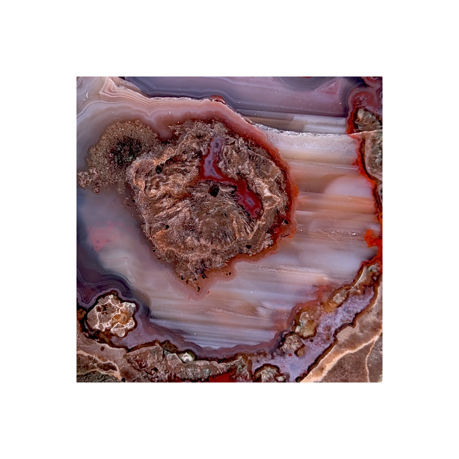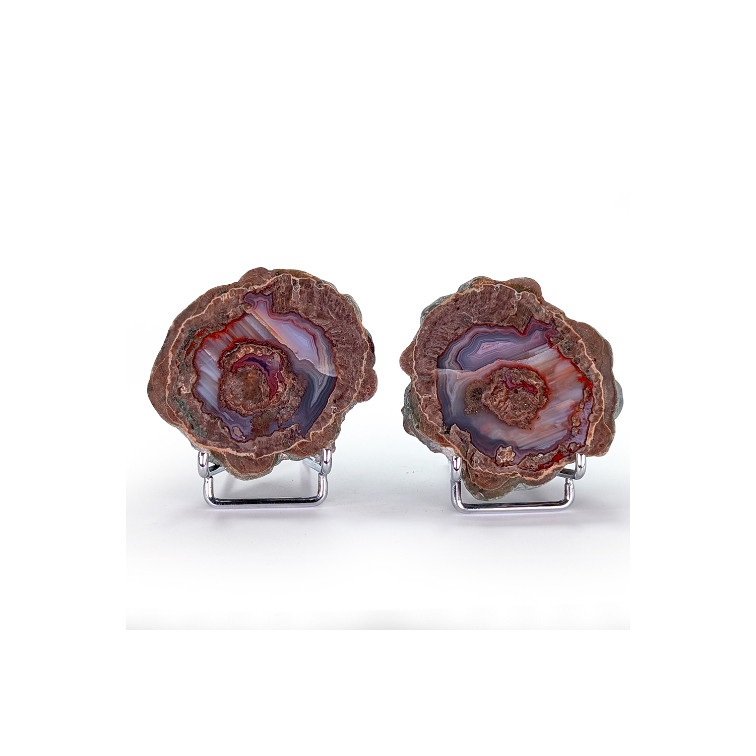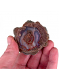 Nodule de lithophyse coupé en deux et poli, offrant un beau motif aux couleurs bien définies.