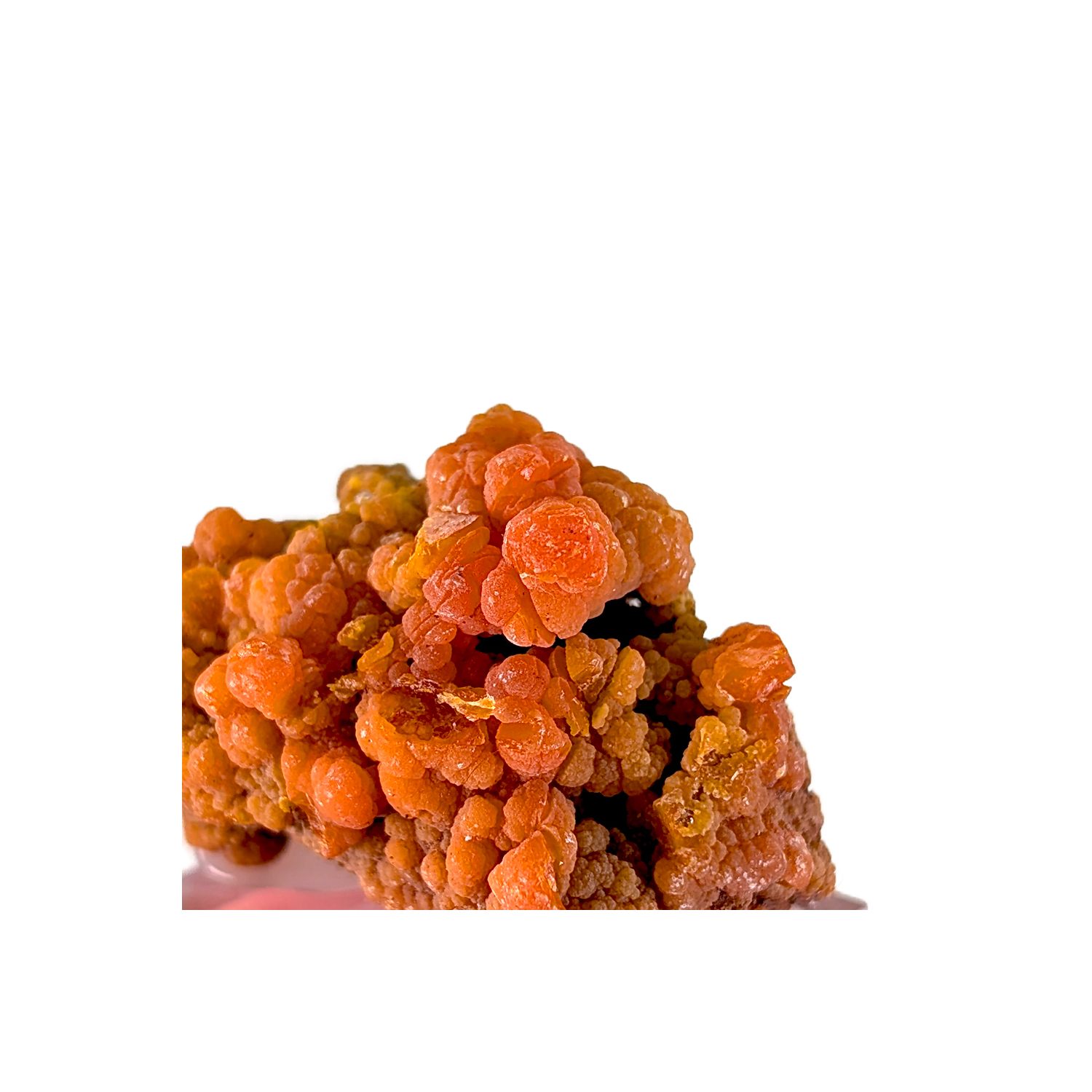 Belle couleur jaune orange pour ce petit échantillon de mimétite, portant les traces d'un second minéral aujourd'hui disparu (baryte ?)