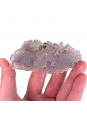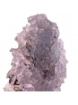 Échantillon d'améthyste, avec des cristaux fins, prismatiques, de couleur lavande, accompagnée par des cristaux de calcite au dos de la pièce.