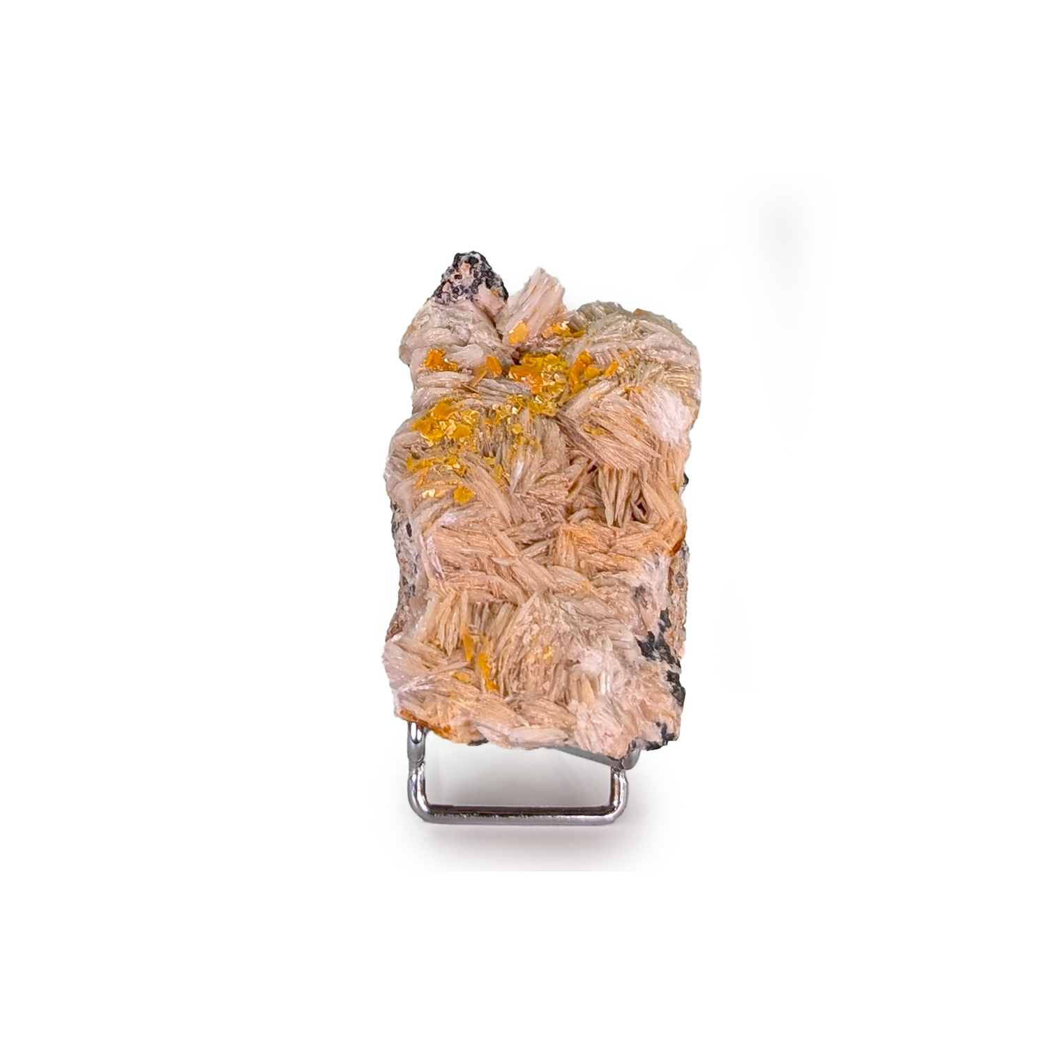 Ancienne pièce présentant des cristaux de wulfénite orange, une cristallisation de baryte crêtée sur deux faces, et de la galène brute dans la gangue.