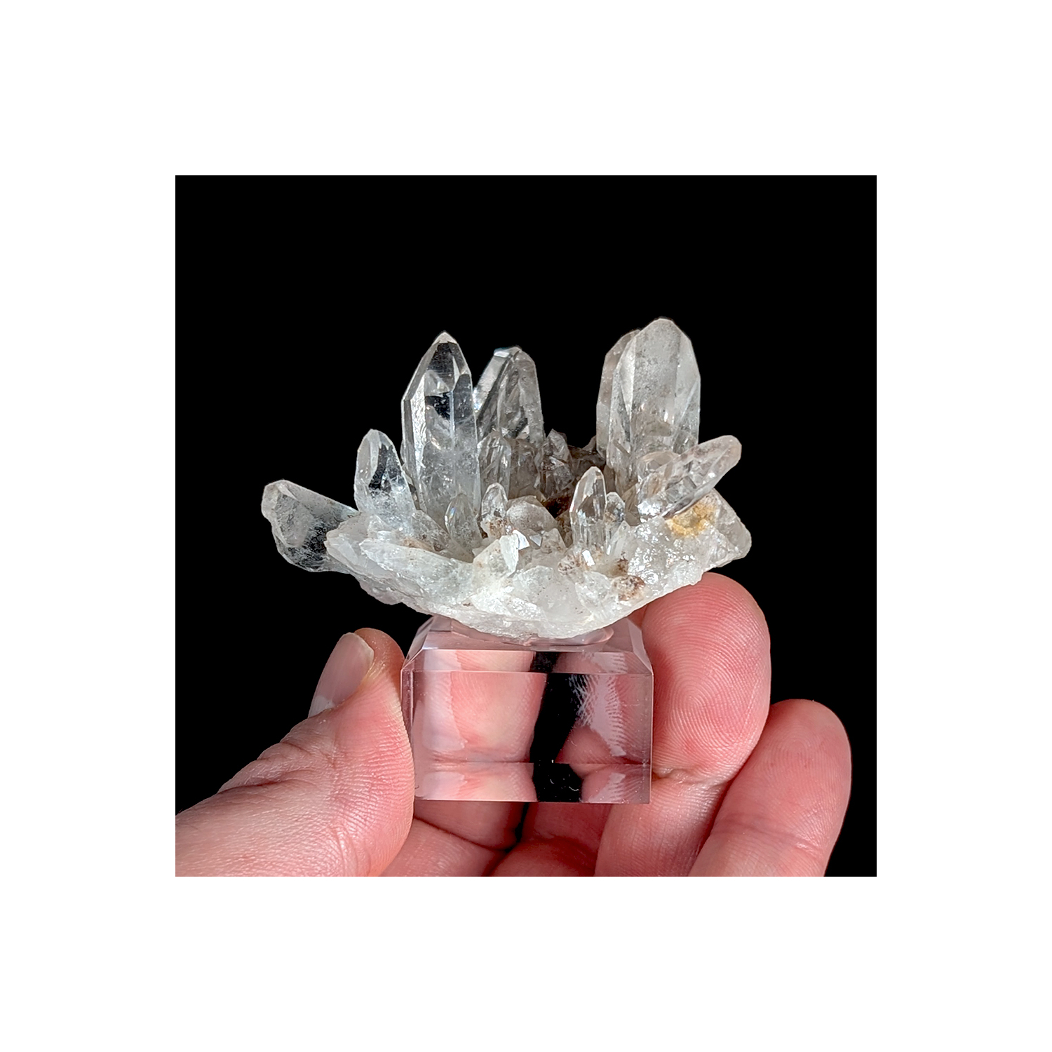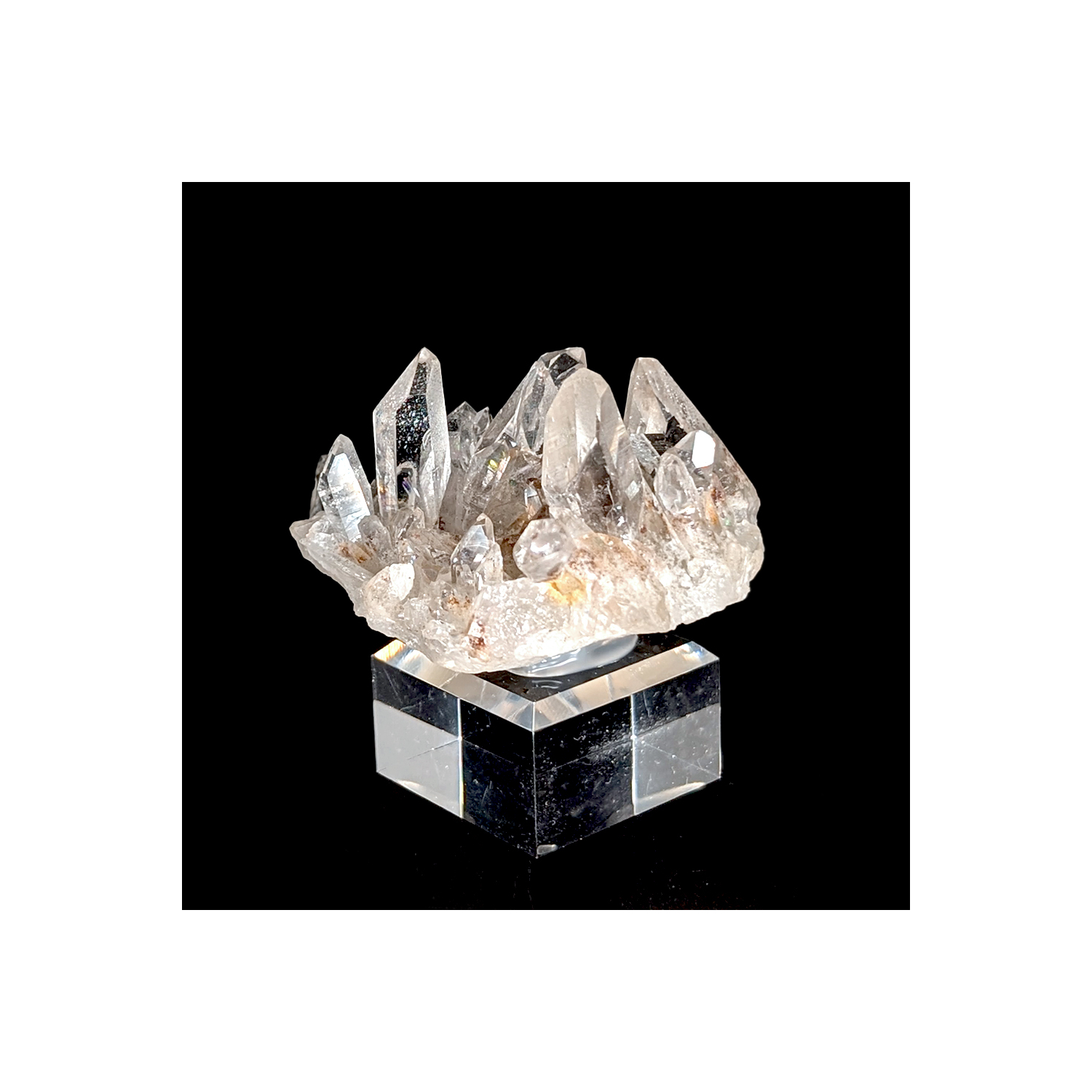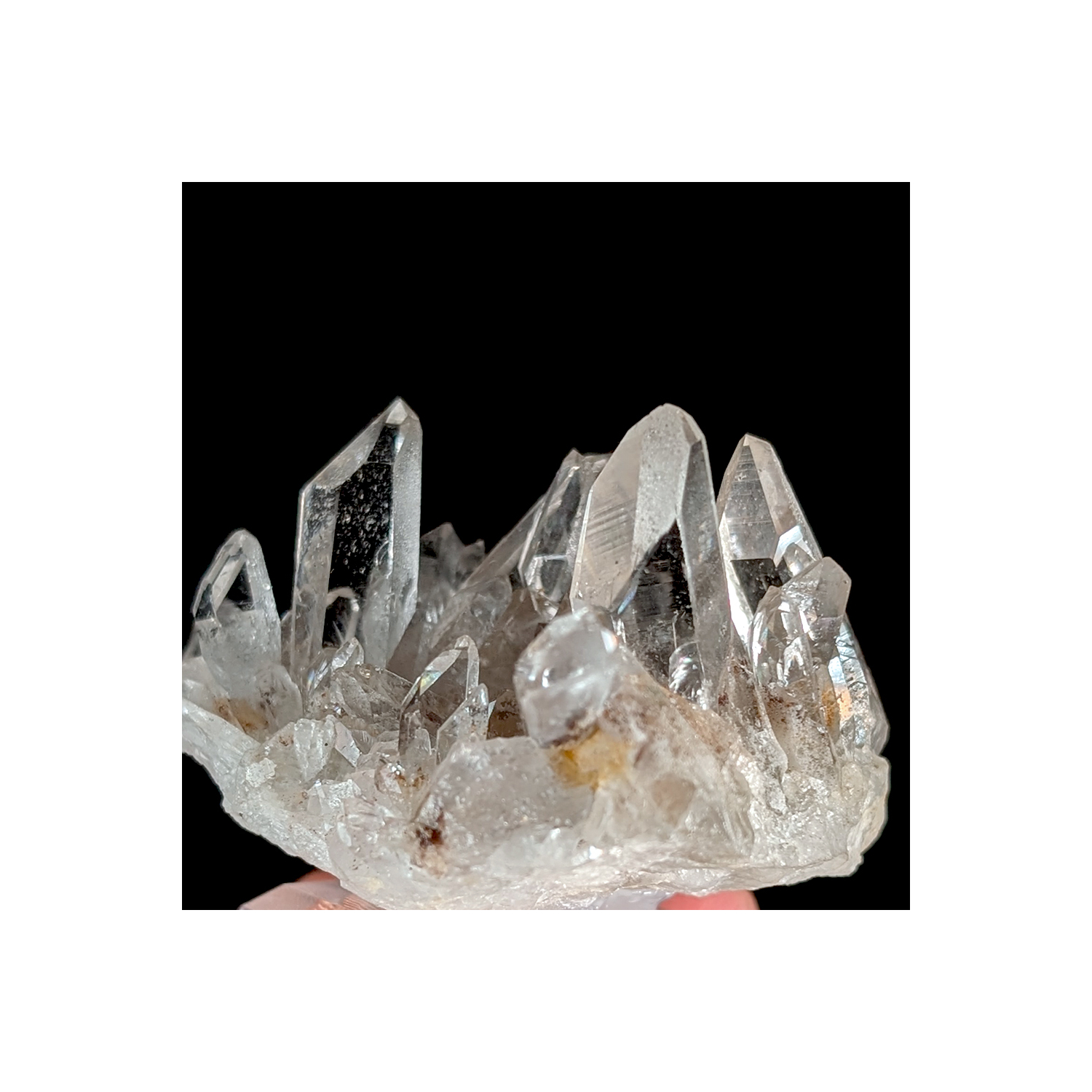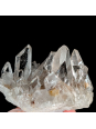 Échantillon de quartz provenant de la mine La Gardette, avec des cristaux limpides contenant quelques oxydes à la base des prismes.