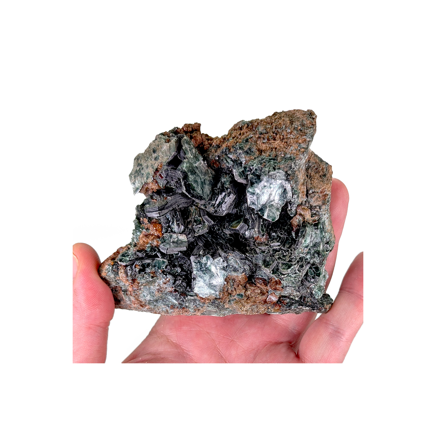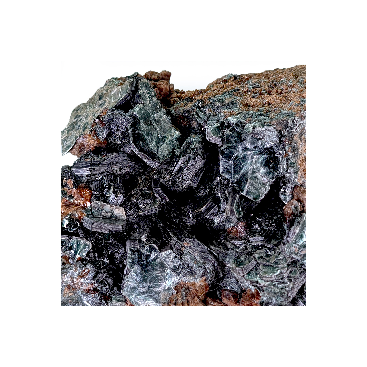 Ancienne pièce de clinochlore, avec des tablettes vertes mesurant plus de 2 cm, sur une gangue riche en grenat hessonite.