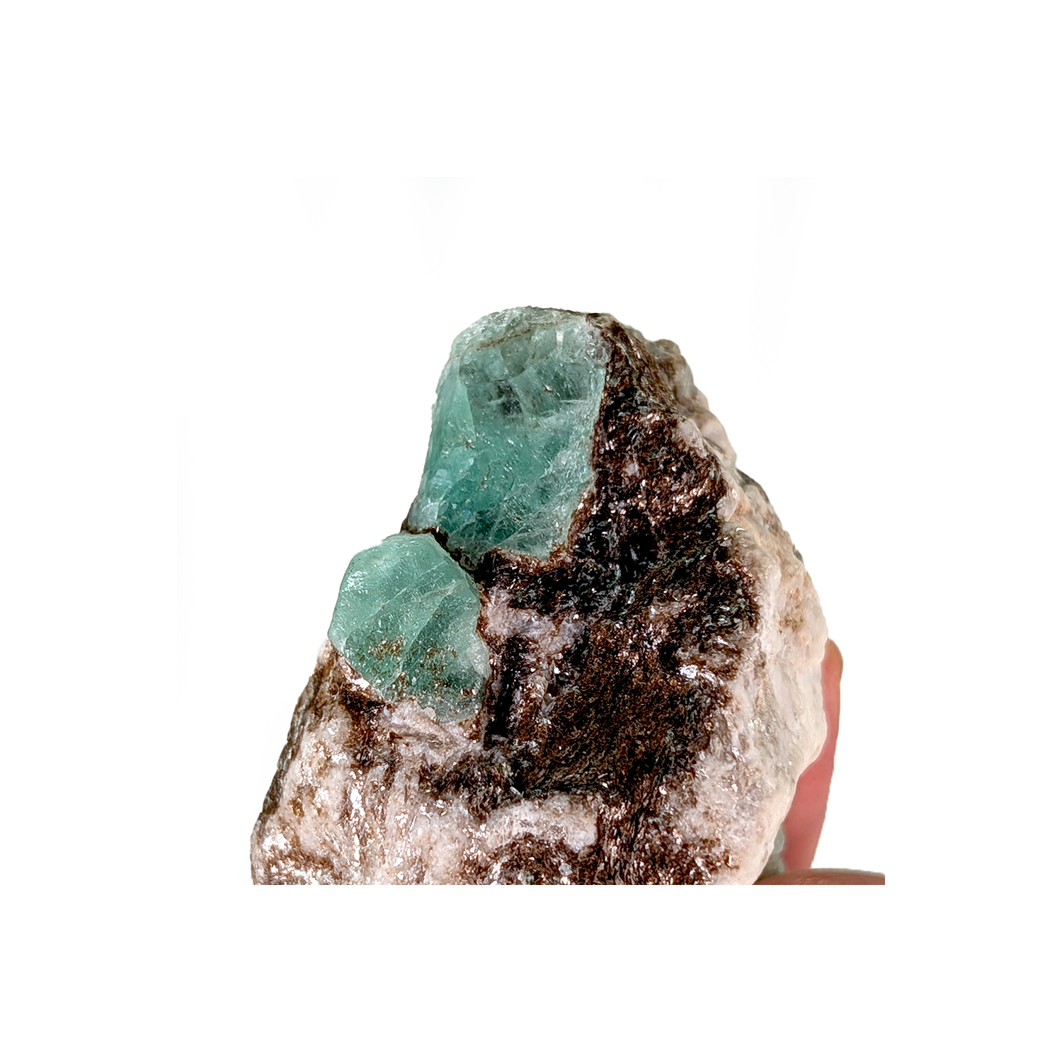 Émeraude provenant d'une mine ouverte depuis 1831, avec plusieurs cristaux centimétriques, verts clairs et transparents.