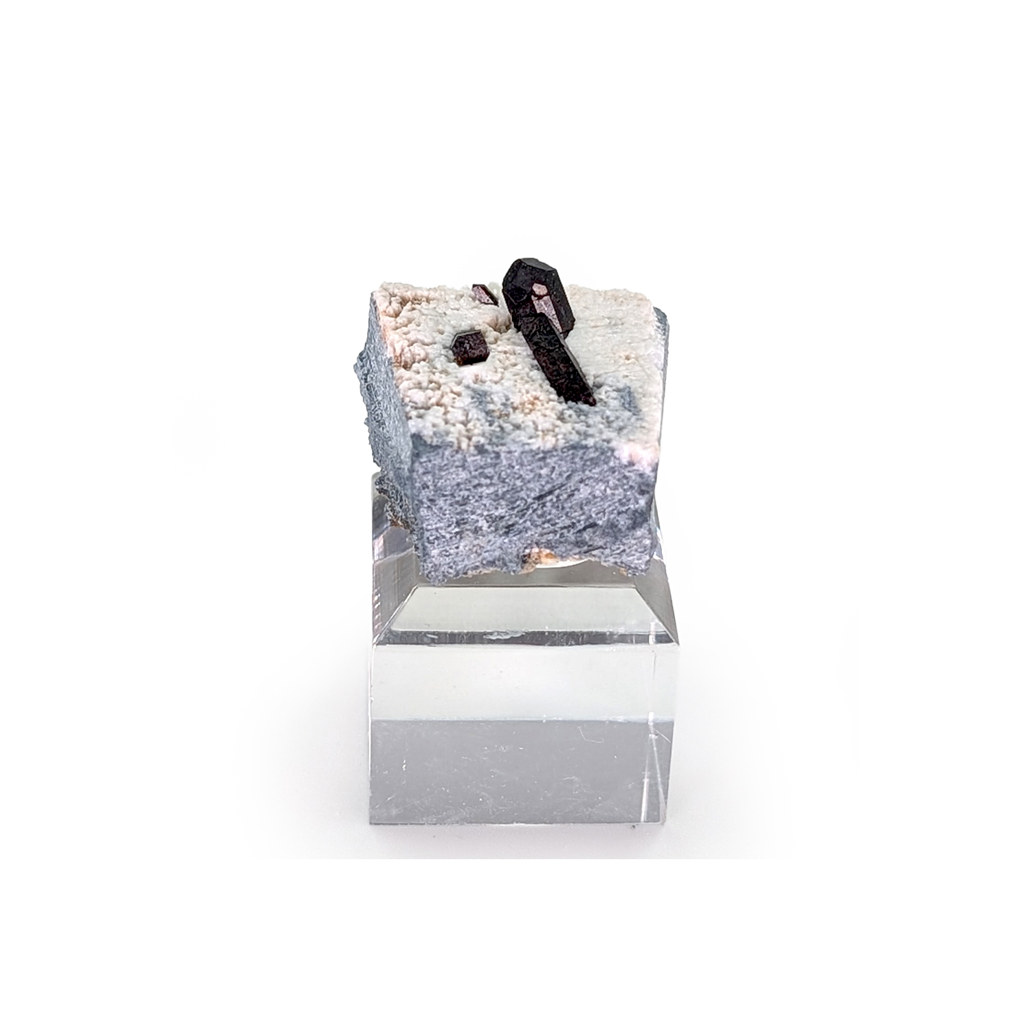 Cristaux de neptunite sur natrolite, dont le plus gros est terminé.