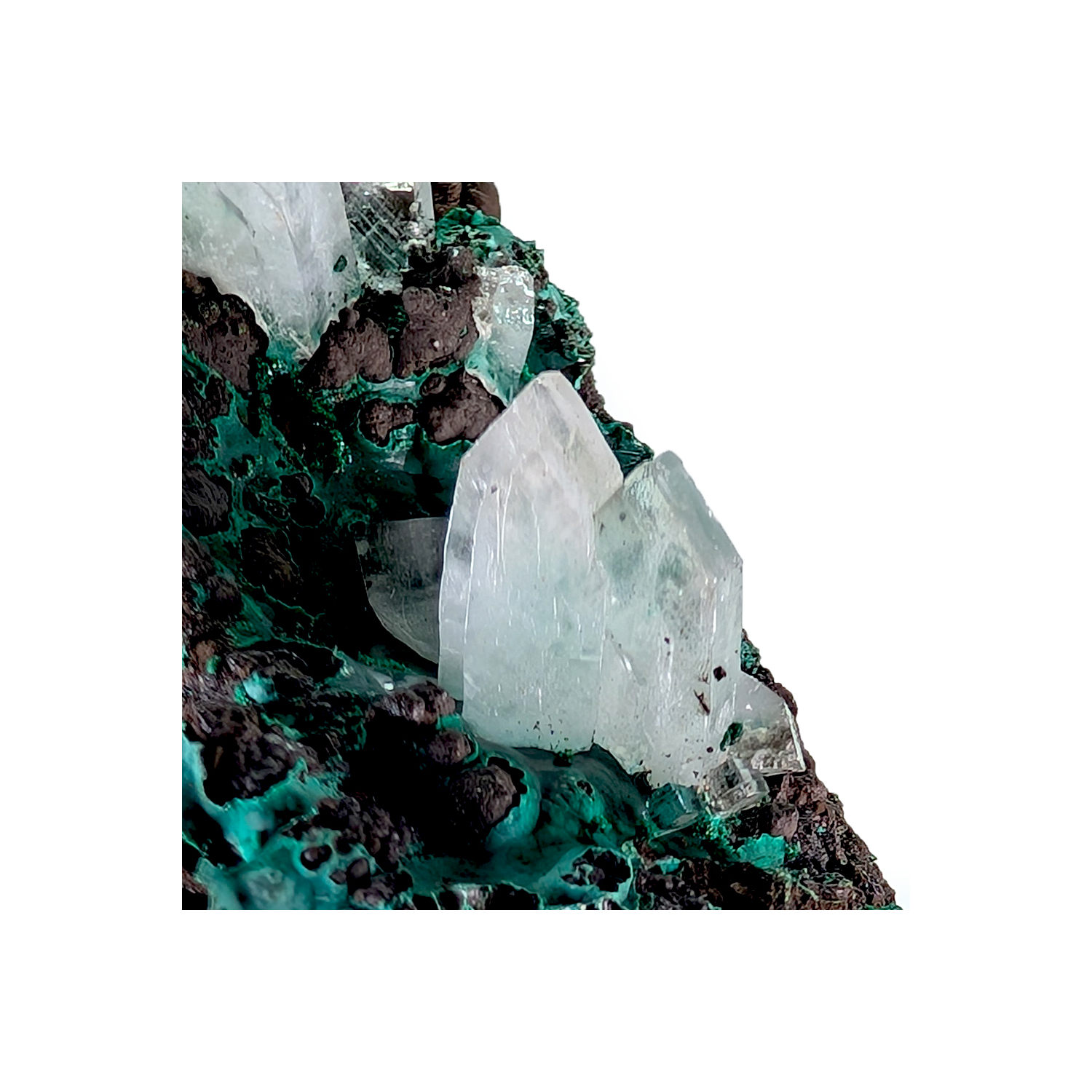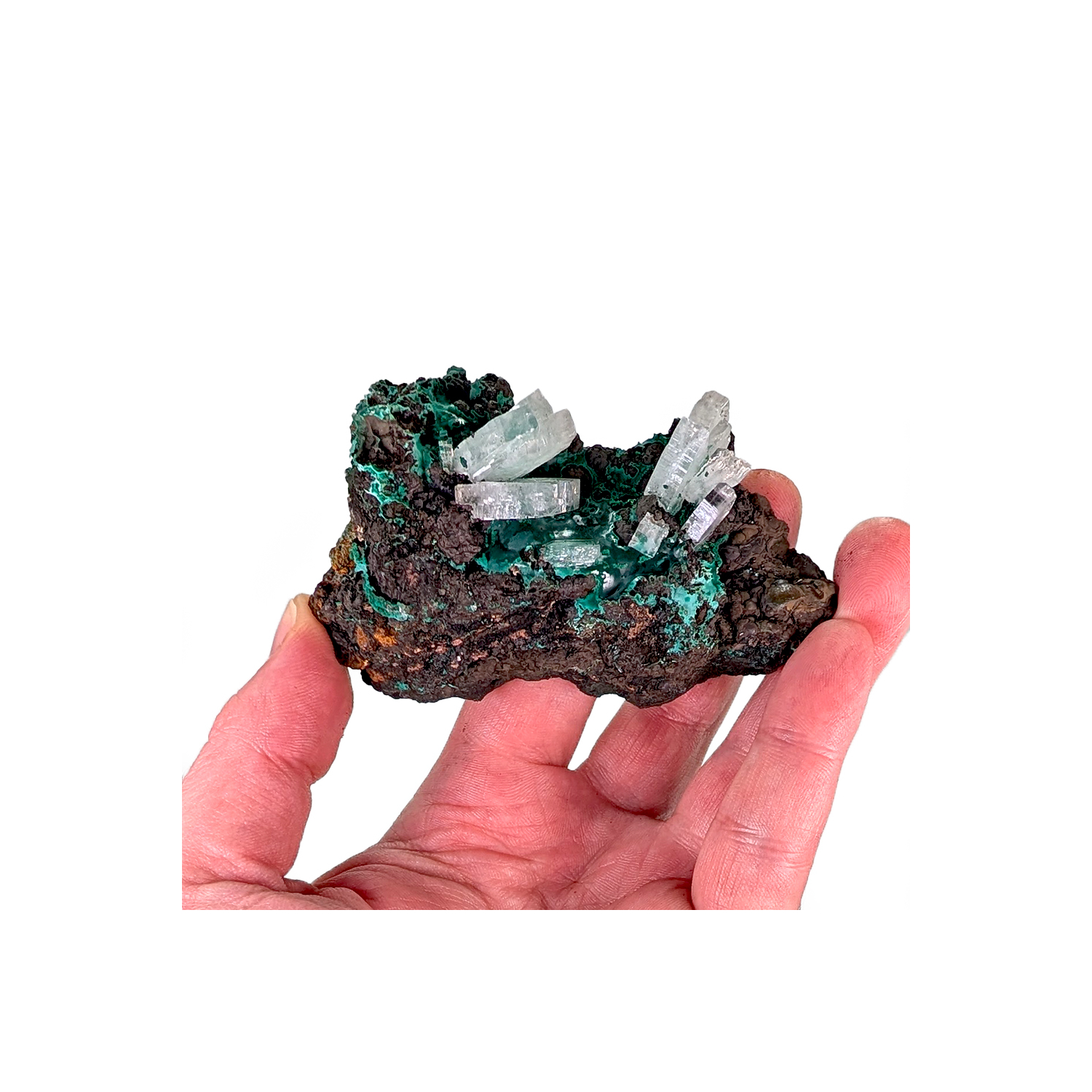 Intéressant minéral présentant des cristaux bleus et terminés de baryte, sur un dépôt de malachite.