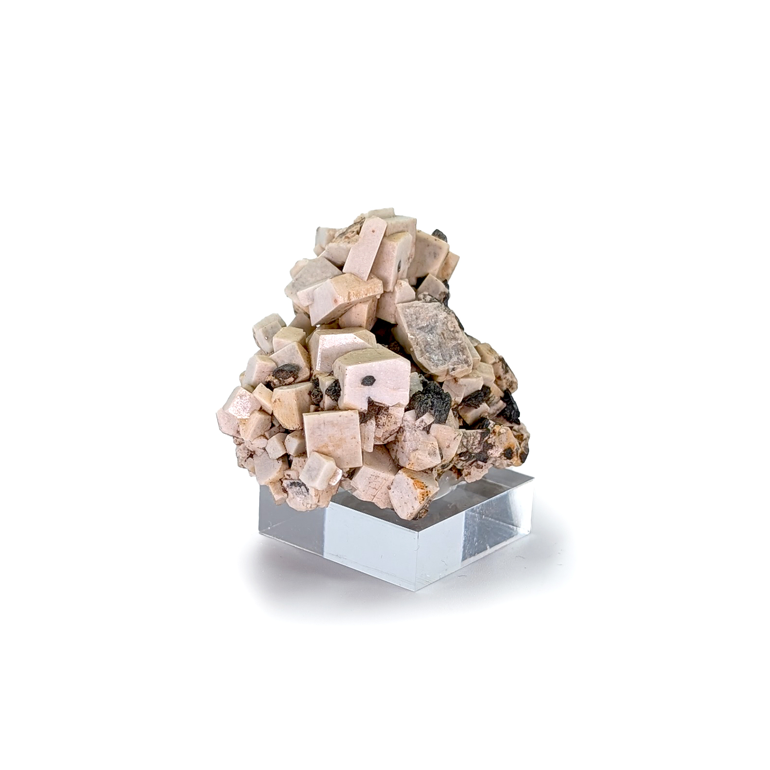Échantillon d'orthose avec des cristaux bien définis et des faces légèrement brillantes, accompagné par de l'actinolite.