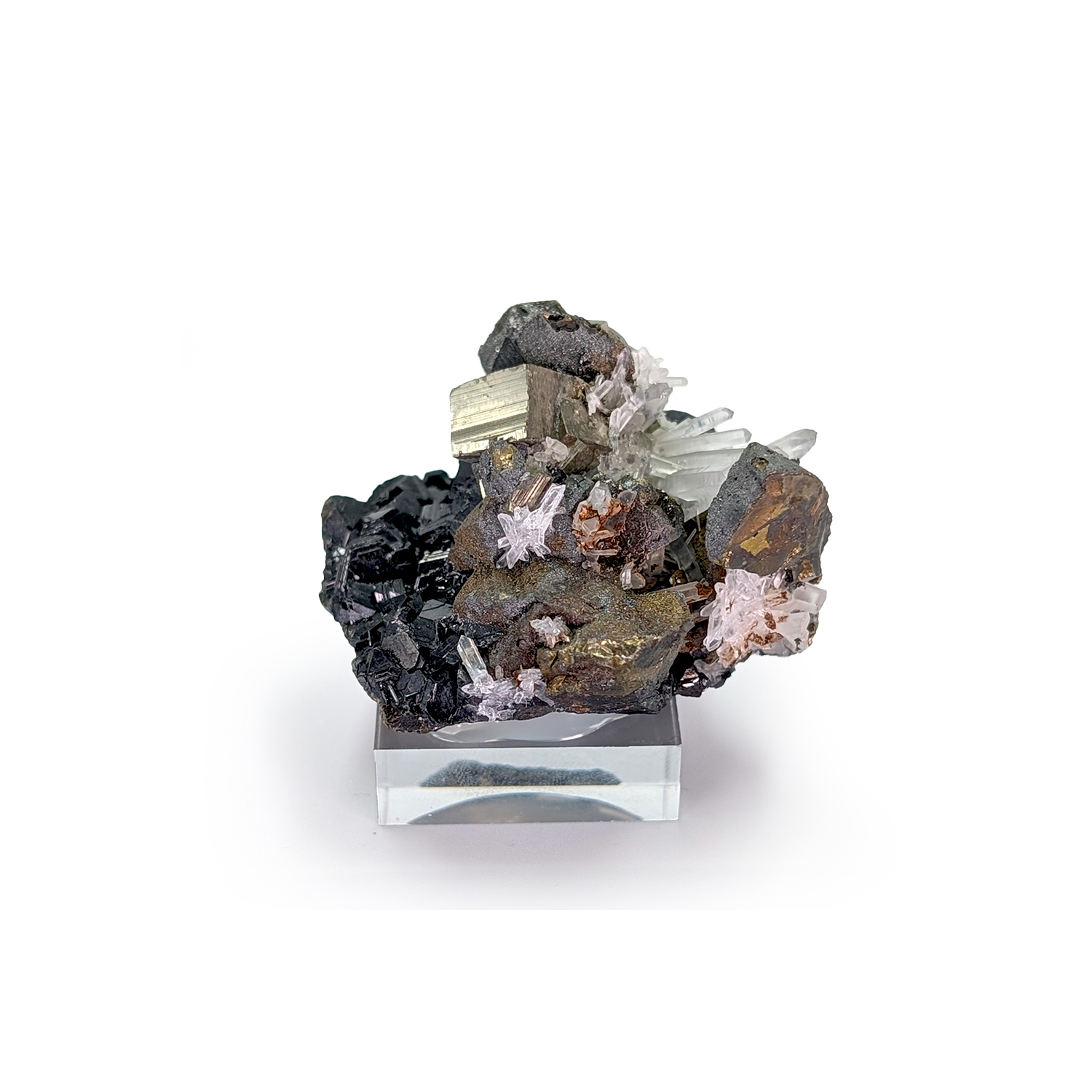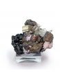 Riche association pour cette pièce datant des années 1980, avec une gangue de sphalérite cristallisée portant des cristaux de chalcopyrite, de pyrite et de quartz transparents.