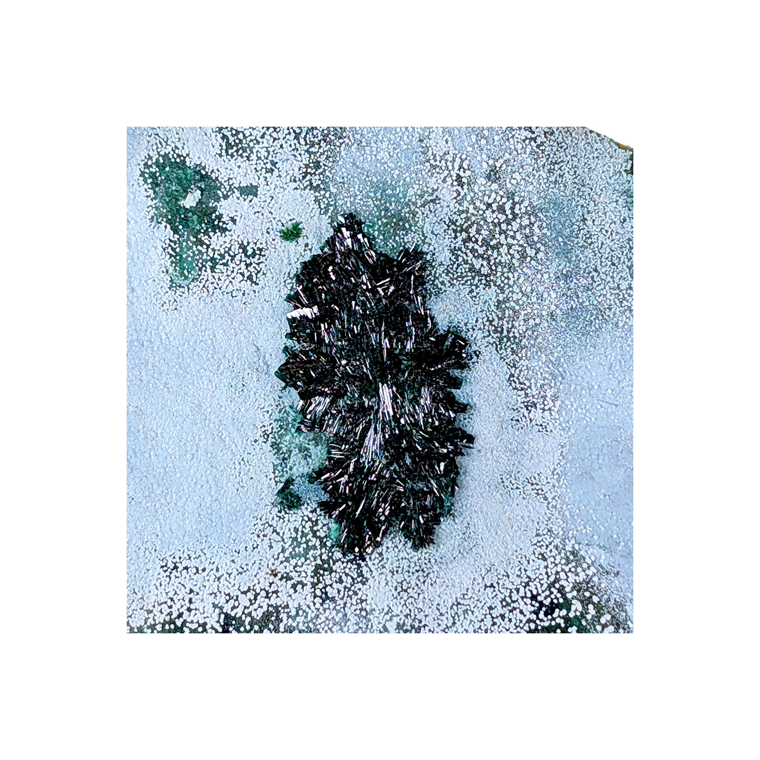 Jolie présentation pour cette atacamite formant un ovale vert brillant sur un fond bleu de chrysocolle.