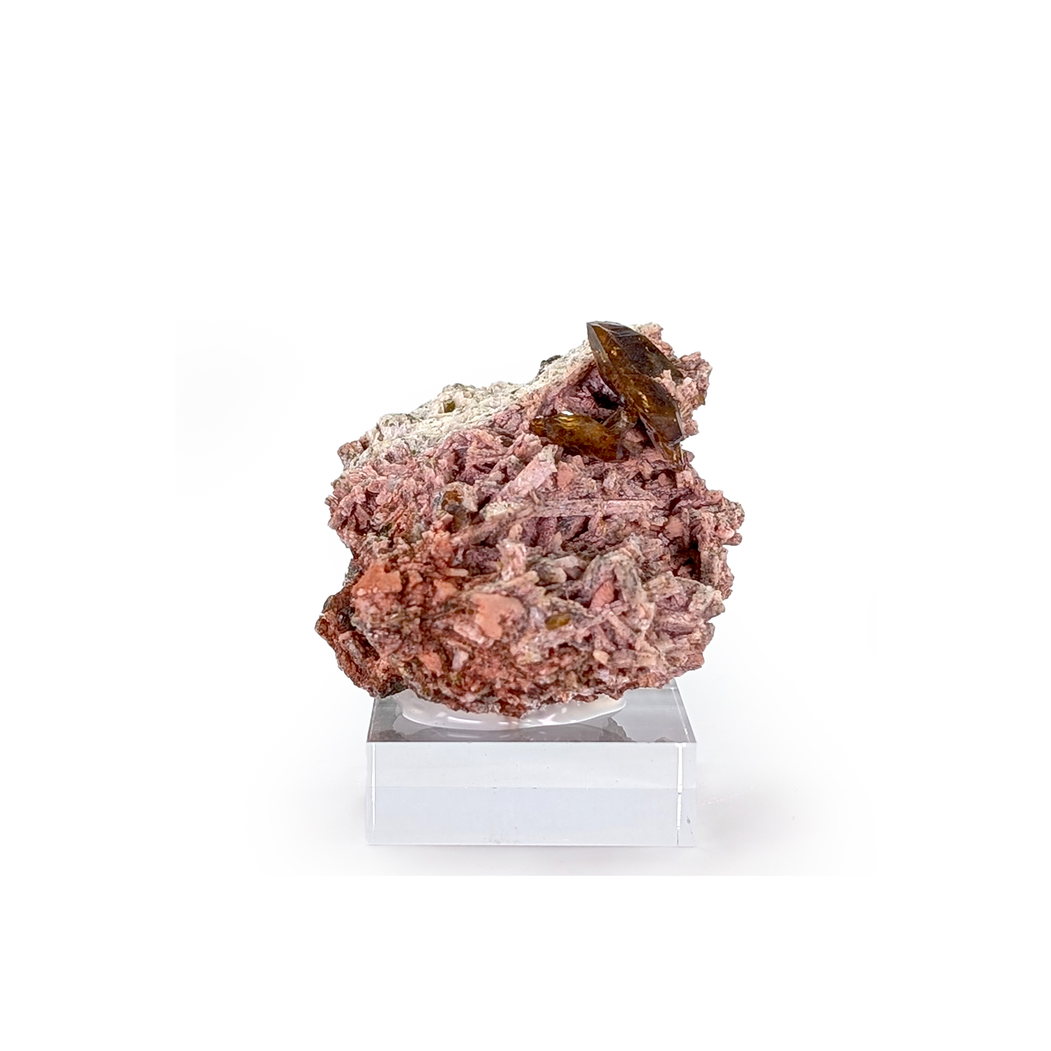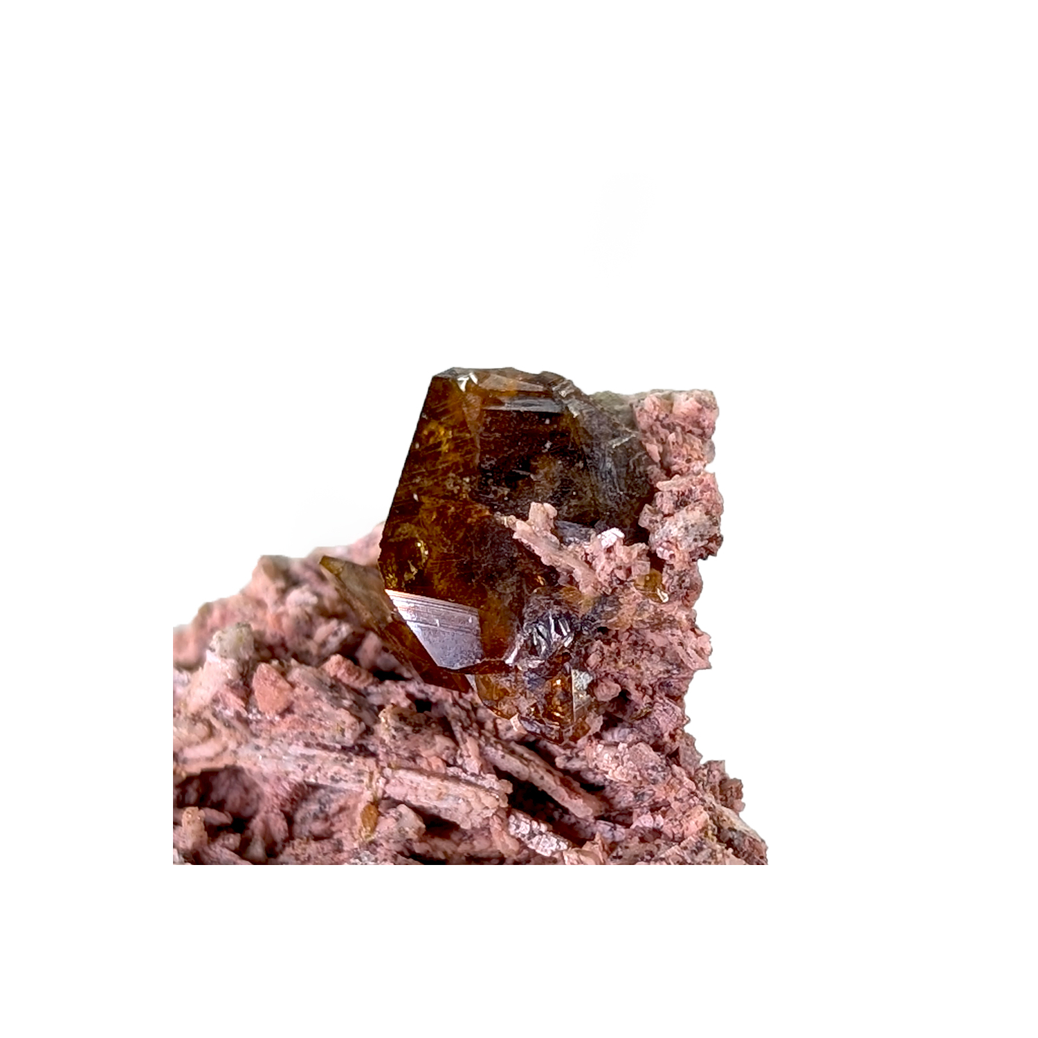 Cristaux de titanite brun jaune, bien définis, sur une gangue de feldspath altéré et teinté par des oxydes.